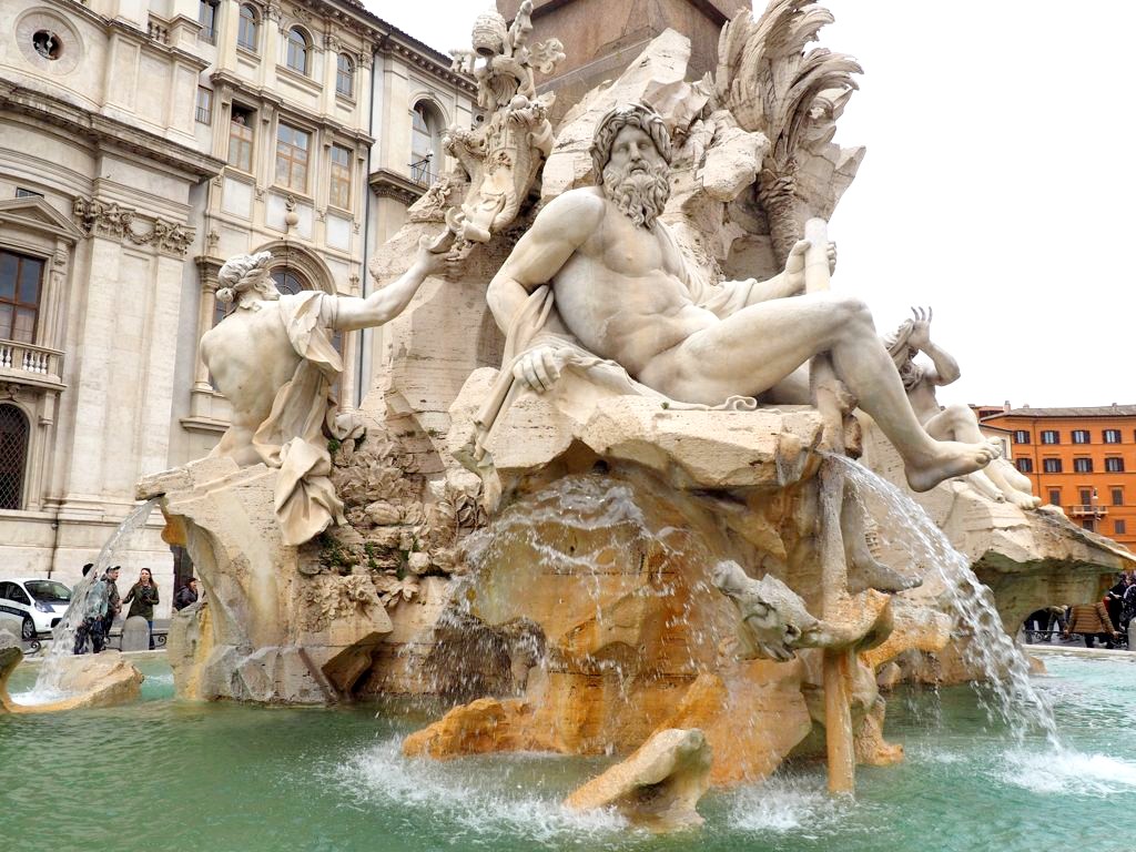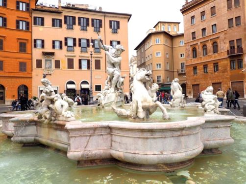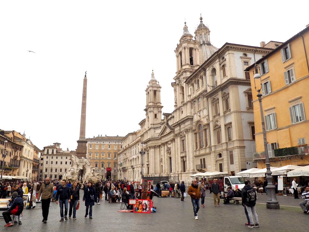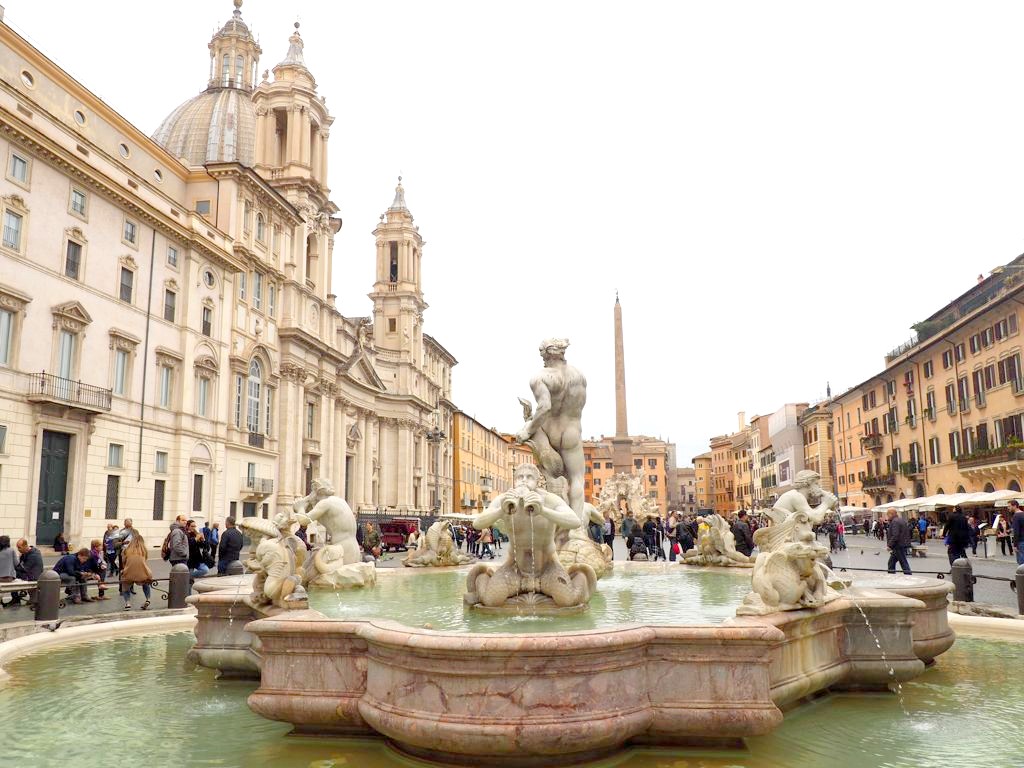 Nous nous sommes ensuite baladé tout l’après-midi dans les environs : d’abord au marché de Campo de’ Fiori, où on a à nouveau craqué pour l’une des meilleures pizzas de Rome, puis nous nous sommes dirigé vers la Piazza Navona en passant par le Palais de la Chancellerie. Ce fut l’une de mes places préférées de Rome, avec ses magnifiques fontaines : dommage que le soleil nous avait un peu quitté à ce moment-là ! Il y a également pas mal d’églises à voir dans le coin.