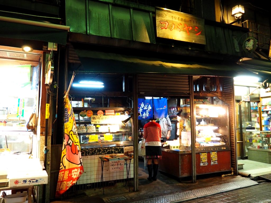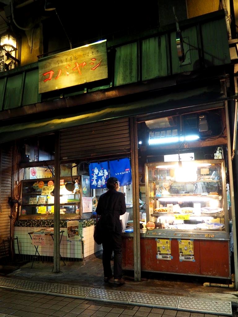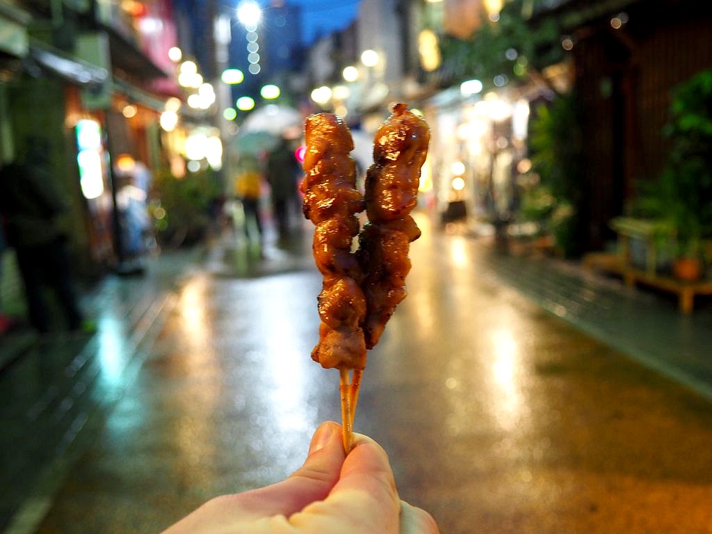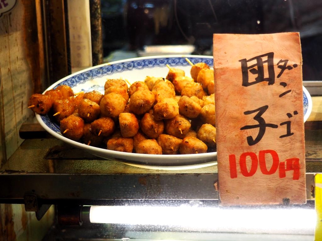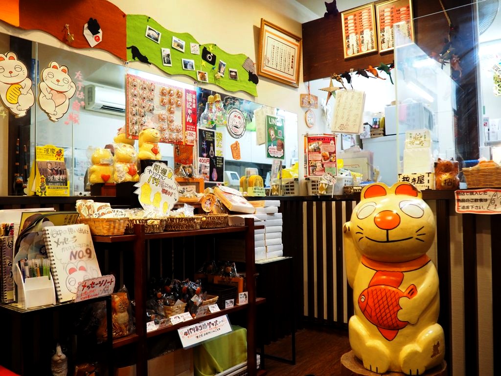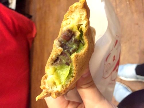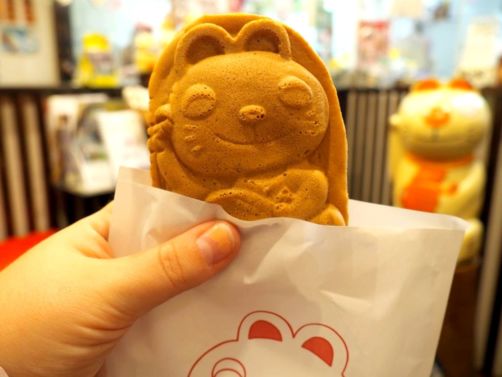 On s’est régalé avec des yakitoris vraiment pas chers, puis on a goûté à notre premier taiyaki ! Il s’agit d’une des street food sucrées préférées des japonais (avec les crêpes), c’est un genre de grosse gaufre normalement en forme de poisson (mais ici en forme de lucky cat, trop mignon !) traditionnellement fourrée à la pâte d’haricots rouges sucrée (anko), ou d’autres types de crème (ici une crème au matcha de folie !). Le petit magasin s’appelle Manekiya Gurume et propose plusieurs variantes (un peu d’attente possible car tout est super frais). C’est celui que j’ai préféré de tous ceux (oups) que j’ai mangé au Japon.