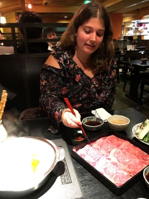 Il faut savoir que le shabu shabu, c’est un peu LA révélation de notre voyage ! On n’en avait jamais mangé et je ne comprends pas pourquoi aucun resto japonais ne propose ça en Belgique. Il s’agit d’une sorte de fondue à la japonaise, avec un bouillon, des légumes, des nouilles, du tofu et des toutes fines tranches de bœuf que l’on trempe dedans. Pas besoin de prendre du Wagyu pour déjà se régaler : la qualité du bœuf au Japon est juste topissime de manière générale !