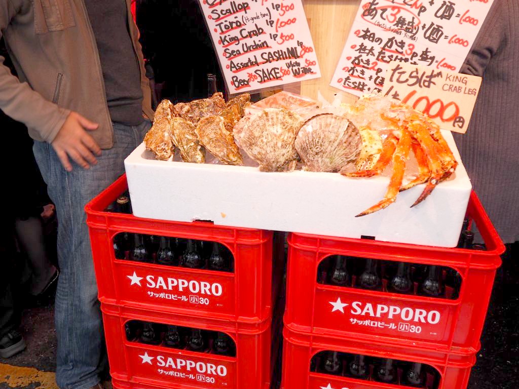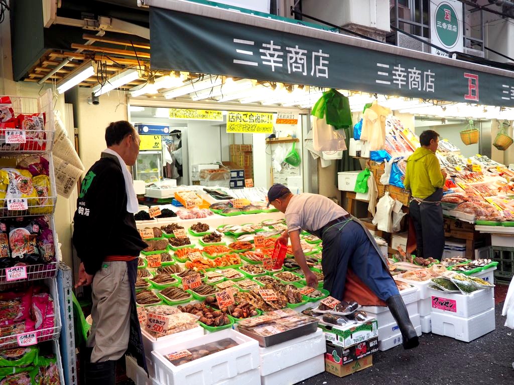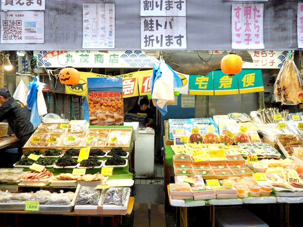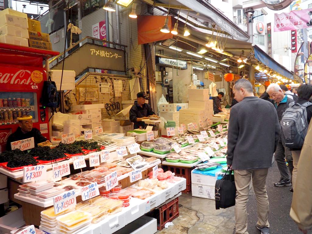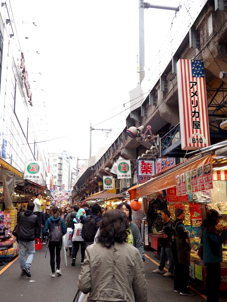 Depuis notre hôtel, on se balade dans des rues typiquement tokyoïtes et après quelques minutes de marche seulement, nous arrivons au marché d’Ameyoko, juste à côté du parc d’Ueno. Il s’agit d’un chouette petit marché populaire (produits frais, petits restos, et un peu de tout le reste) qui longe les voies de train (certains magasins se trouvent même sous les voies !) en direction de la gare d’Ueno.