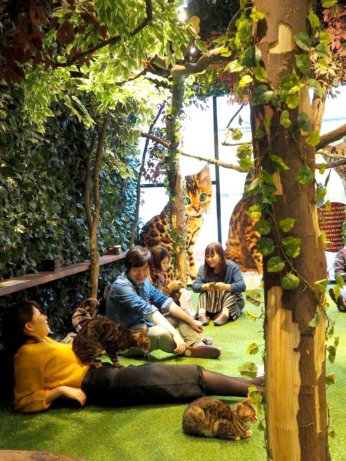 Comme il pleuvait beaucoup, après notre repas on a décidé de s’engouffrer directement dans le cat café juste en face, le Harajuku Bengal Cat’s and Owl’s Forest. Bon. La partie cat cafés avec les chats du bengal, c’était sympa. Il n’y a pas de tables donc on doit s’installer à terre dans cette espère de petite forêt en attendant que les chats viennent nous voir (on ne peut pas les forcer), et ils étaient très calins.