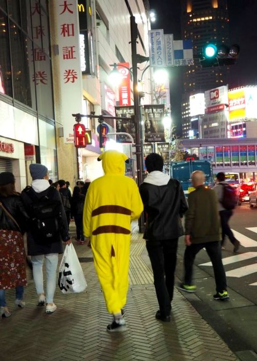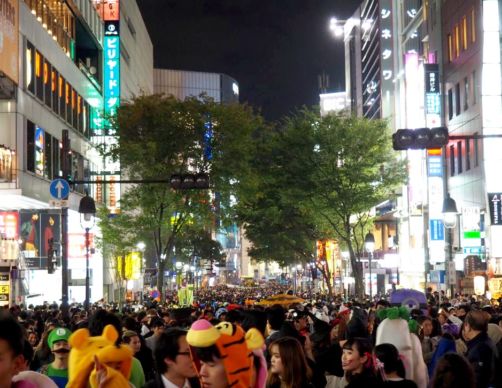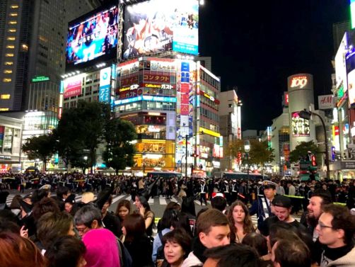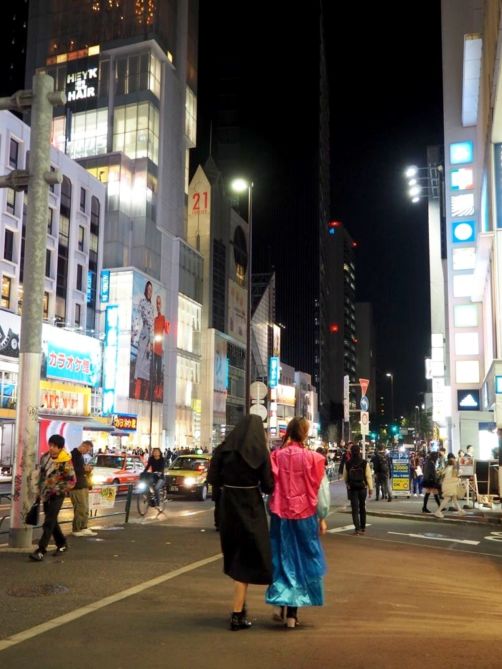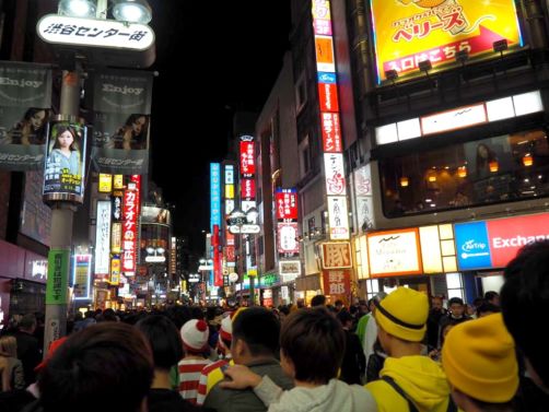 Lors de ma première visite de ce quartier, nous avions eu la « bonne idée » de vouloir aller voir le passage pour piétons le plus fréquenté du monde (Shibuya Crossing), un soir d’Halloween, alors que le tout Tokyo a décidé d’aller se déguiser et se pavaner là-bas… Si je m’étais demandée jusque là où étaient passés tous les habitants de Tokyo (ça fait mégapole assez vide en général), ben là j’ai trouvé où se cachait la foule ! Ils attendaient tranquillement chez eux de pouvoir sortir leurs plus beaux costumes le soir d’Halloween ! Je vous laisse chercher ma petite tête paniquée dans la foule dans les photos qui suivent !