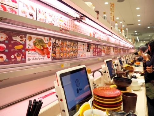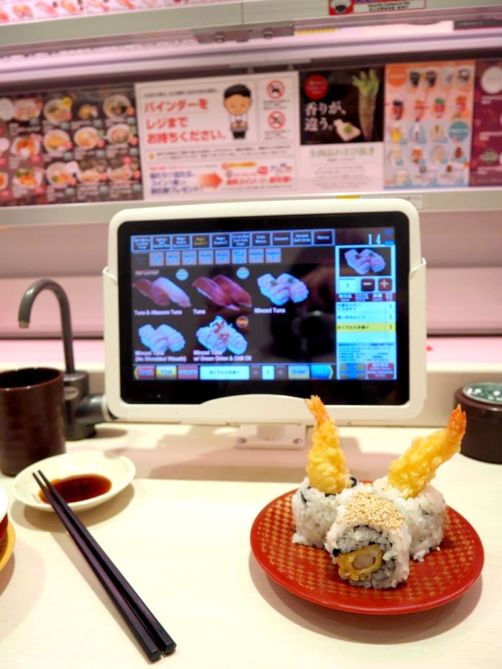Dans ce quartier, on a beaucoup aimé le restaurant Genki Sushi Uobei, un restaurant high tech puisque vous commandez vos sushis sur un petit écran tactile qui se trouve devant vous et ceux-ci arrivent à la vitesse de l’éclair sur un petit plateau automatisé qui s’arrête devant vous ! Super sympa et vraiment pas cher !