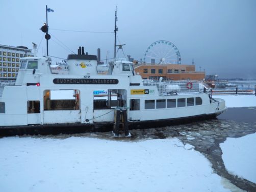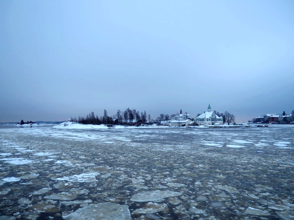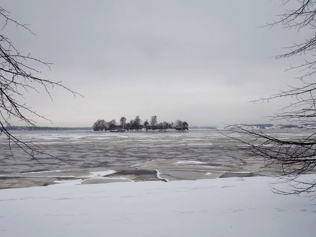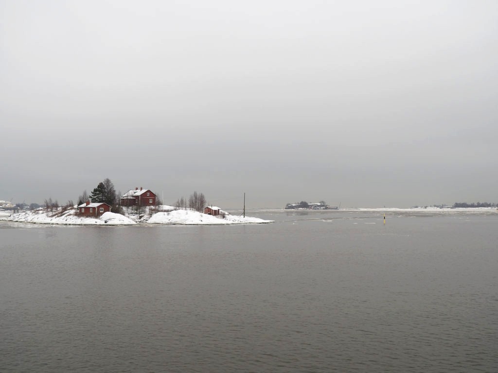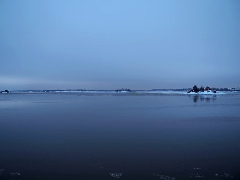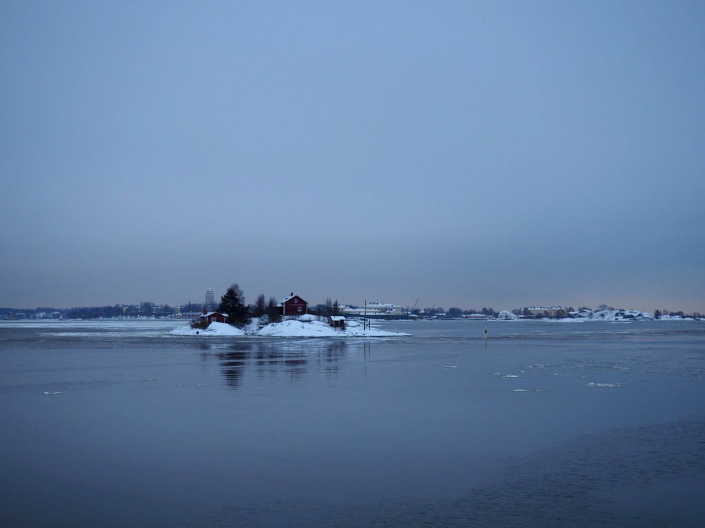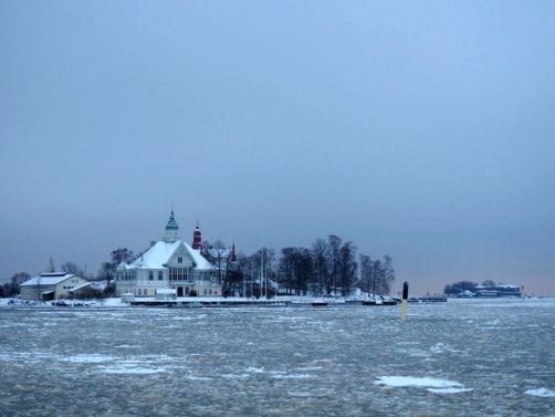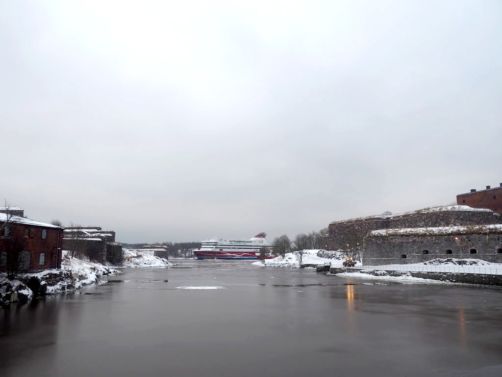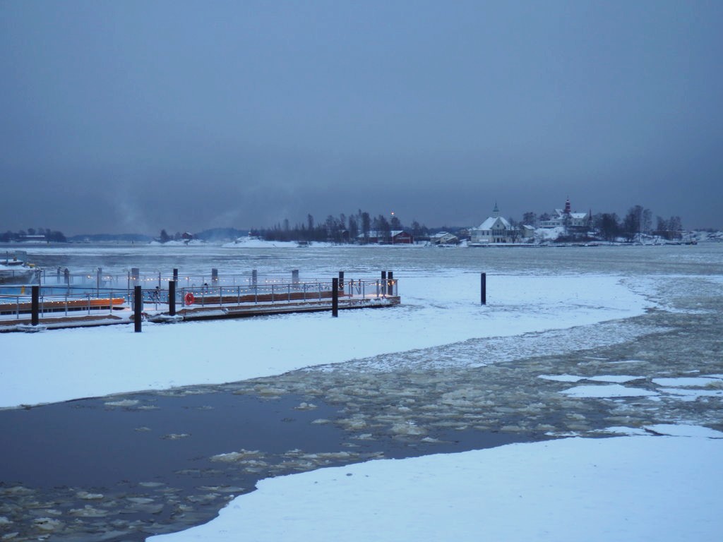 L’hiver, il y a des ferrys toutes les 30 minutes depuis le port d’Helsinki et comme c’est la Finlande, ça roule qu’il pleuve qu’il vente ou qu’il neige, pas de chichis. Et ce jour-là, malgré le non-lever de soleil vu le ciel couvert et « l’heure bleue » qui semblait sans fin, nous avons ainsi assisté à une traversée incroyable vers Suomenlinna puisque nous étions un des premiers bateaux ce jour-là à briser la glace dans le port et dans la baie d’Helsinki.