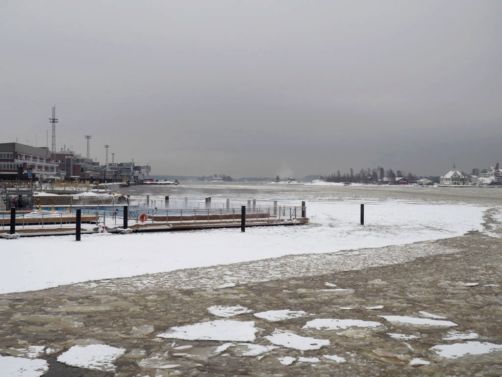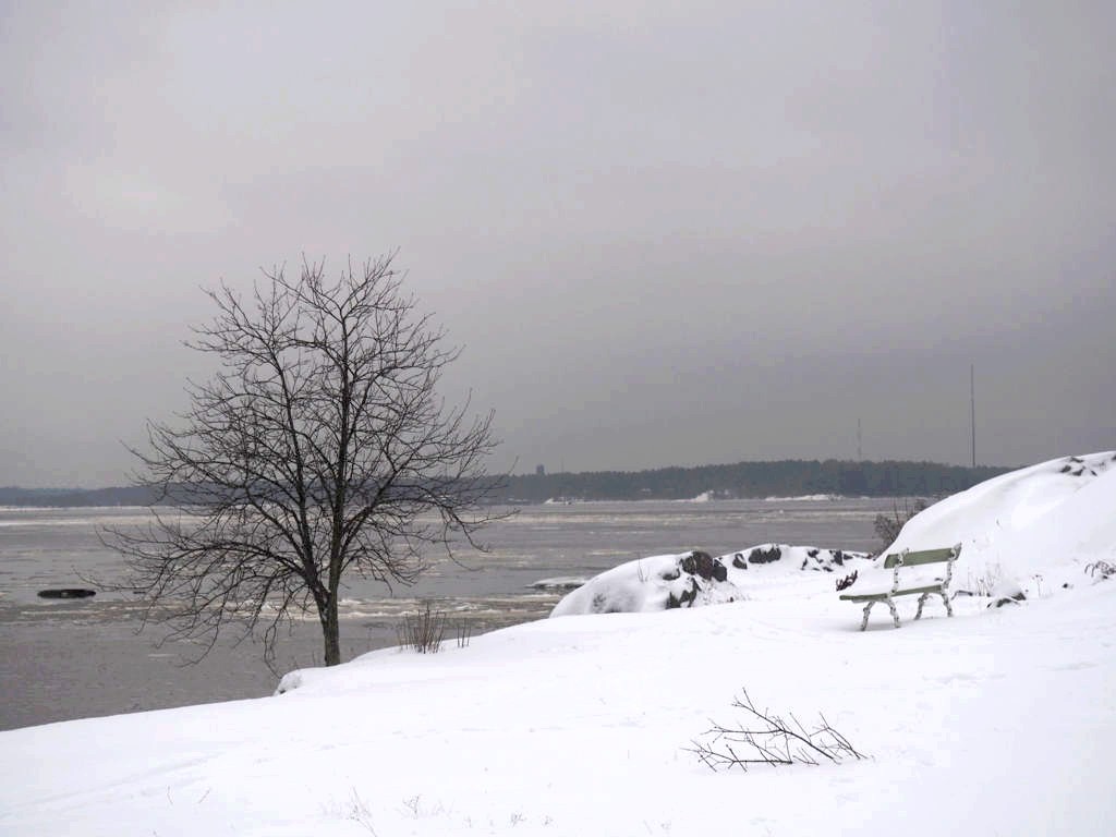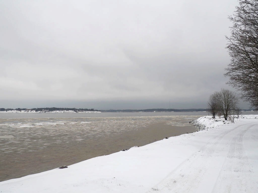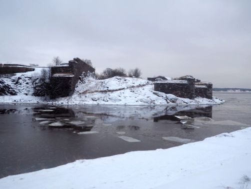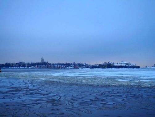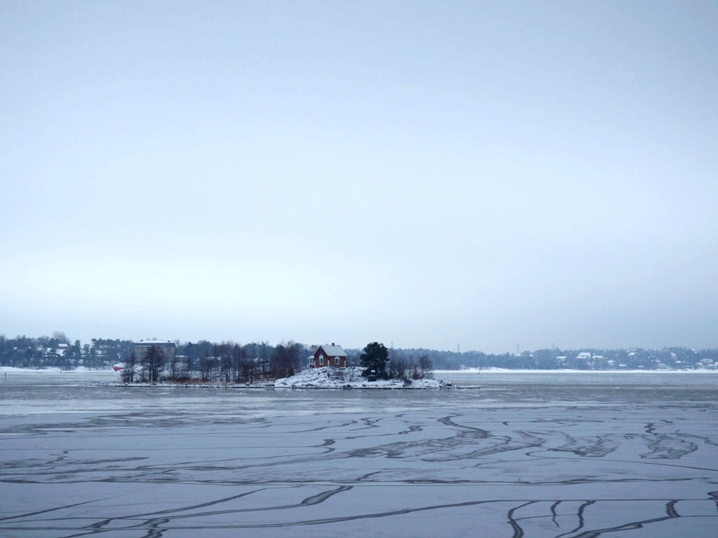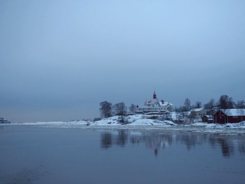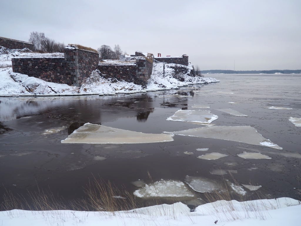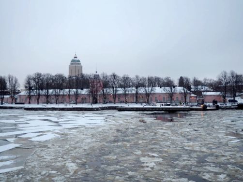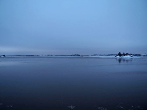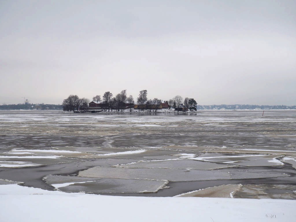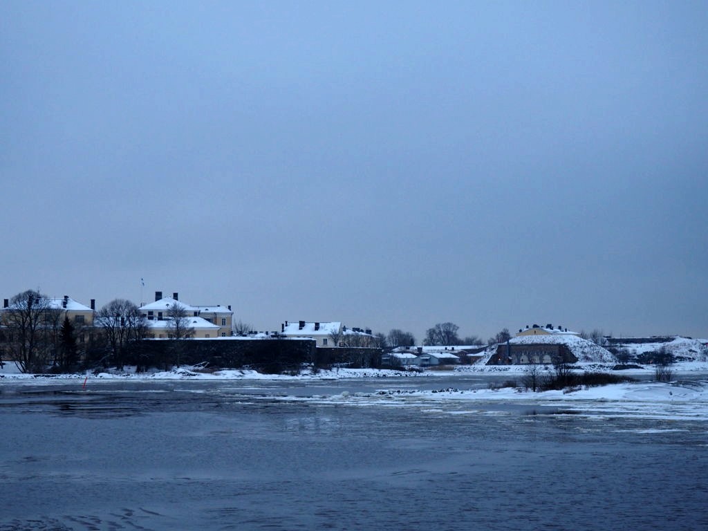 L’hiver, il y a des ferrys toutes les 30 minutes depuis le port d’Helsinki et comme c’est la Finlande, ça roule qu’il pleuve qu’il vente ou qu’il neige, pas de chichis. Et ce jour-là, malgré le non-lever de soleil vu le ciel couvert et « l’heure bleue » qui semblait sans fin, nous avons ainsi assisté à une traversée incroyable vers Suomenlinna puisque nous étions un des premiers bateaux ce jour-là à briser la glace dans le port et dans la baie d’Helsinki.