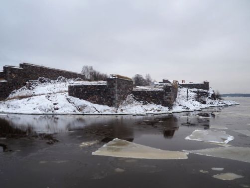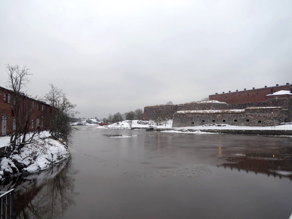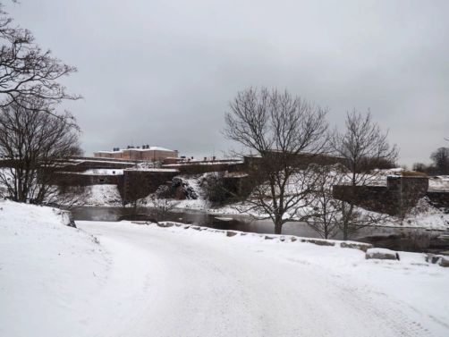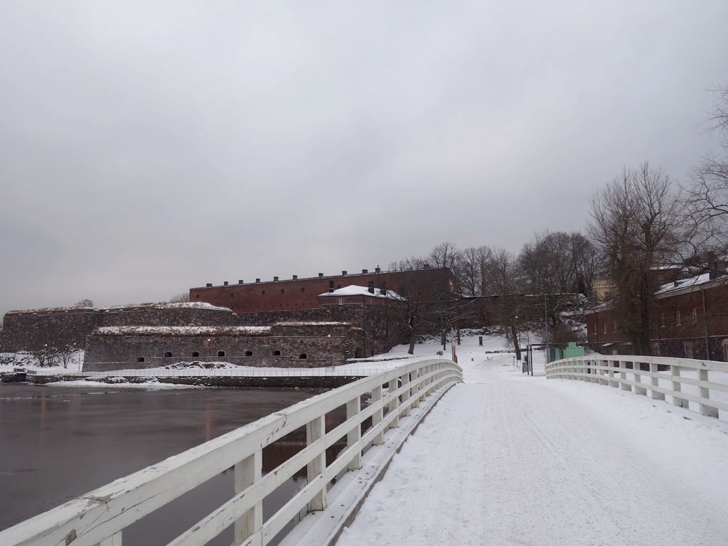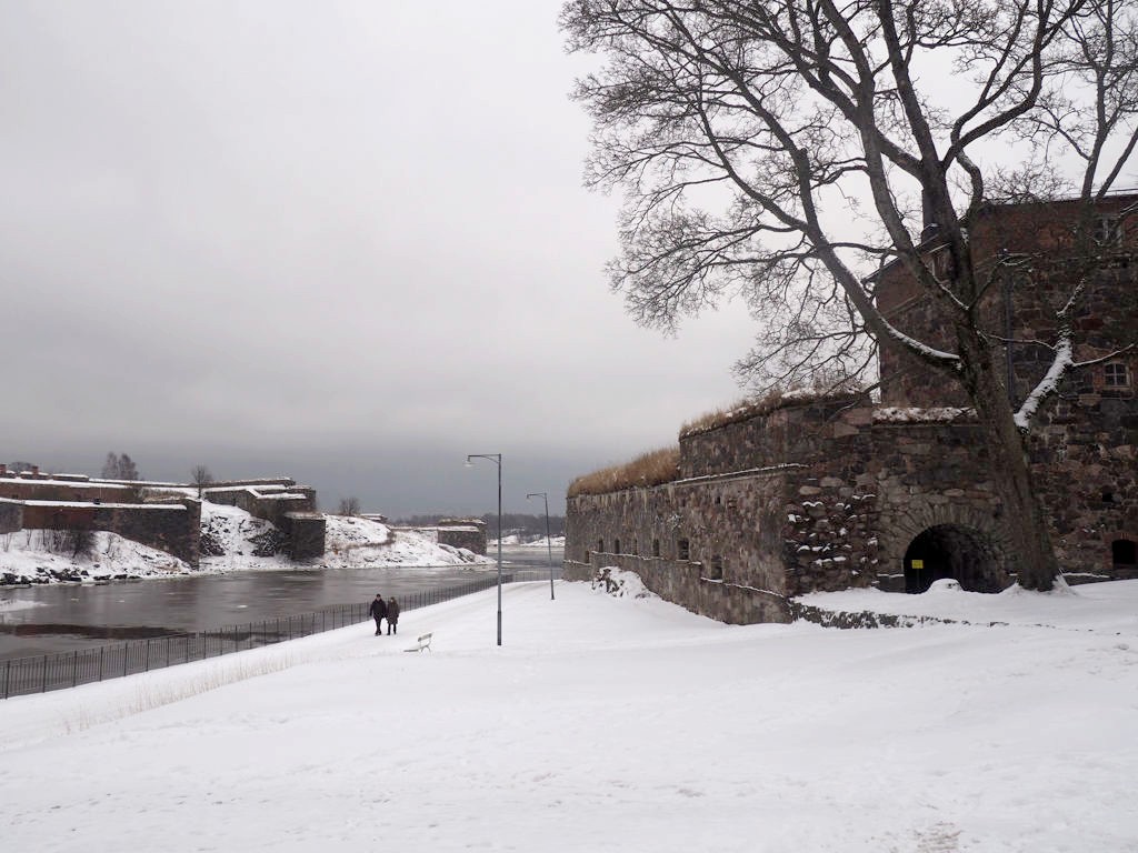 On a décidé de s’en tenir plus ou moins à l’itinéraire suggéré sur la brochure (« l’itinéraire bleu » – apparemment signalé par des pancartes bleues, sauf que celles-ci devaient être recouvertes de neige…), qui traverse les deux îles principales. Puisqu’en fait, Suomenlinna est formée de 4 petites îles reliées entre elles par des ponts.