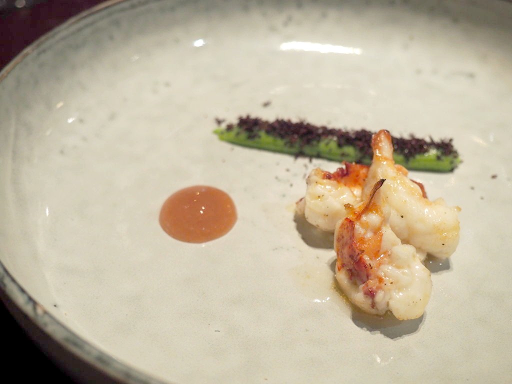 Nous continuons avec une deuxième entrée à la présentation beaucoup plus simple, mais non moins délicieuse : le homard accompagné d’avocat, shiso rouge et furikaké. Un plat fusion très réussi !