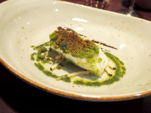 Nous poursuivons avec un autre plat de poisson, de petite pêche : le filet de merlu en croûte d’herbes, air noir, vinaigrette au xéres et herbes fraîches.