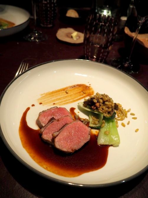 Enfin, place au plat de résistance, le filet d’agneau Origine France cuit à basse température, accompagné d’un jus d’agneau « Teriyaki » (magnifique !), pak choï, et Maitake tout droit venu… des caves de Cureghem !