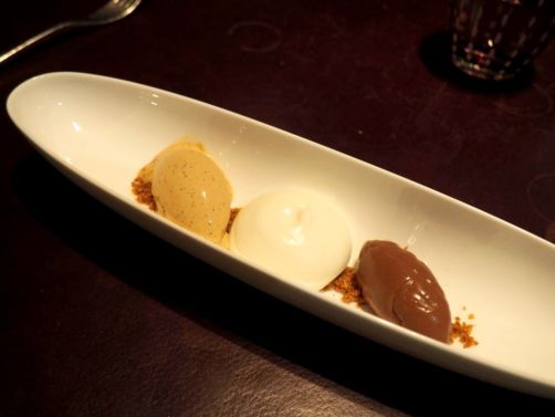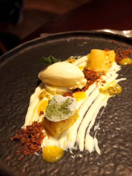 Pour terminer, une petite note sucrée ! Tout d’abord avec un petit pré-dessert, trois boules de glace maison chocolat, mascarpone et praline, puis un délicieux dessert à base d’ananas, coco et passion, suivi enfin de quelques mignardises maison.
