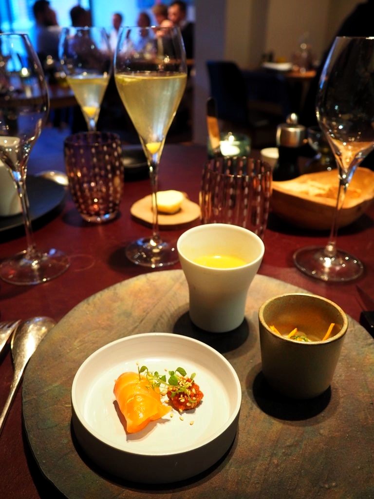 Nous débutons donc ce menu (5 services) aux accents japonisants par quelques mises en bouche : petit flan, saumon au yuzu et une bisque de crevette à l’ail des ours tout simplement exquise !