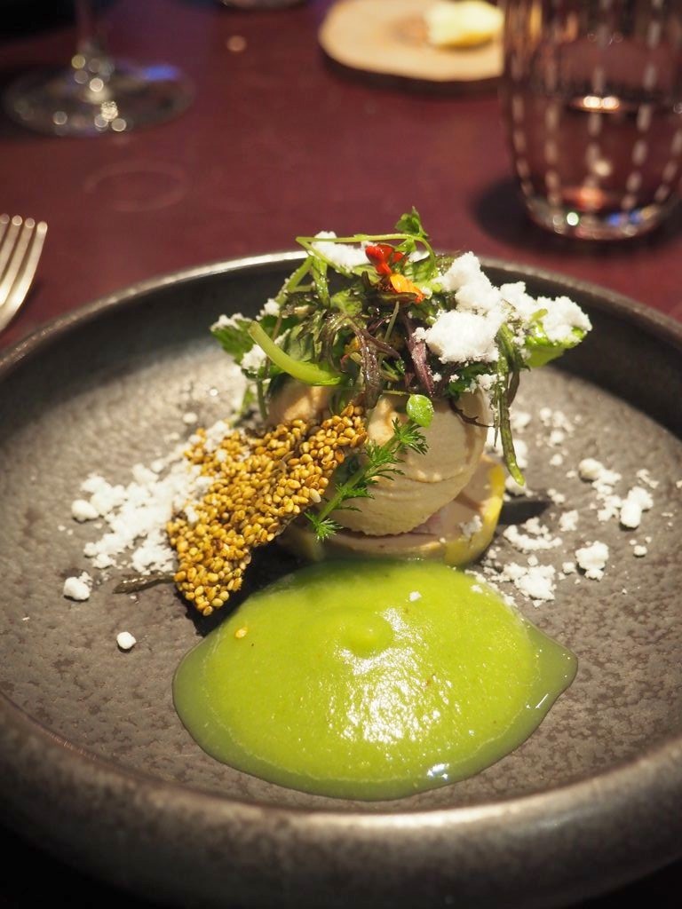 En première entrée, nous dégustons une jolie préparation à base de foie gras et d’anguille fumée. Une belle association accompagnée de pomme, céleri, wasabi, tuile au sésame et poudre de manioc.