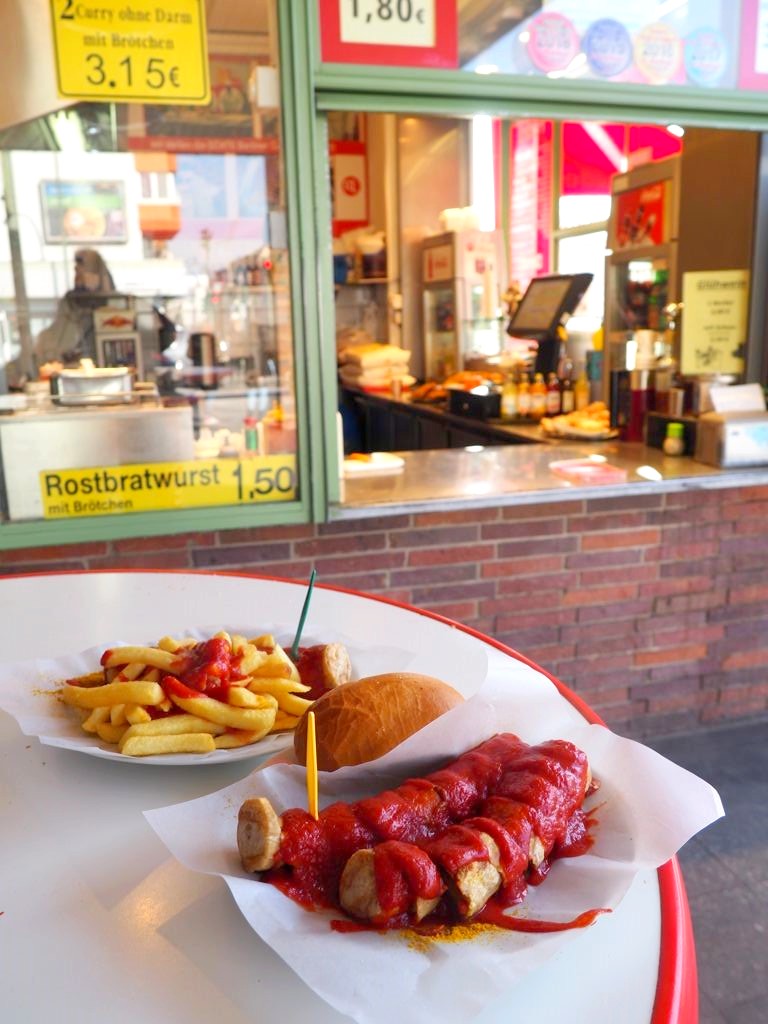 Ce n’est pas le choix qui manque mais certains sont très populaires. Parmi les grands classiques (sans pour autant devoir faire la file comme à certains autres endroits), on a beaucoup aimé Curry Baude. Ce n’est pas de la grande gastronomie, mais si vous avez un petit budget, vous pouvez vous caler sans problème pour quelques euros dans un des stands à currywurst comme celui-ci !