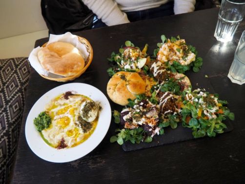 Kanaan est un petit, très petit, restaurant isréalo-palestinien végétarien qui ne paie vraiment, mais vraiment pas de mine (le bâtiment est en construction, on dirait que l’on entre dans un chantier… mais non ! typiquement berlinois…). L’accueil est charmant, on nous a expliqué toute la carte pour nous aider à choisir (c’est vrai que ce n’était pas facile de s’y retrouver entre tous les types de houmous !).