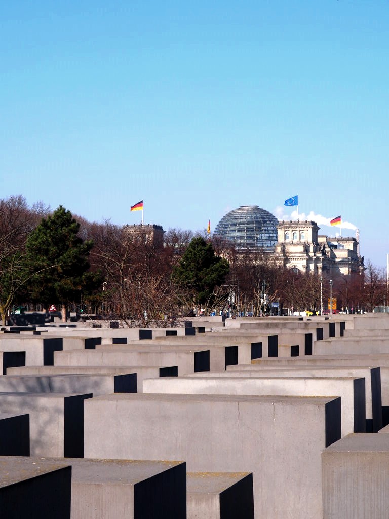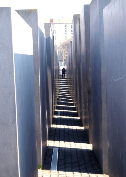 Non loin de la Porte de Brandebourg se trouve le Mémorial aux Juifs Assassinés d’Europe, un mémorial surprenant et émouvant organisé en deux parties : tout d’abord le mémorial en soi, mais un mémorial inhabituel puisqu’il est formé de 2711 dalles de béton d’hauteurs différentes. L’expérience consiste à marcher entre celles-ci, la pente du sol variant elle-aussi, ce qui donne un certain sentiment de malaise, ou en tout cas de déstabilisation, on se sent vite perdu – une symbolique sans doute voulue par l’architecte.