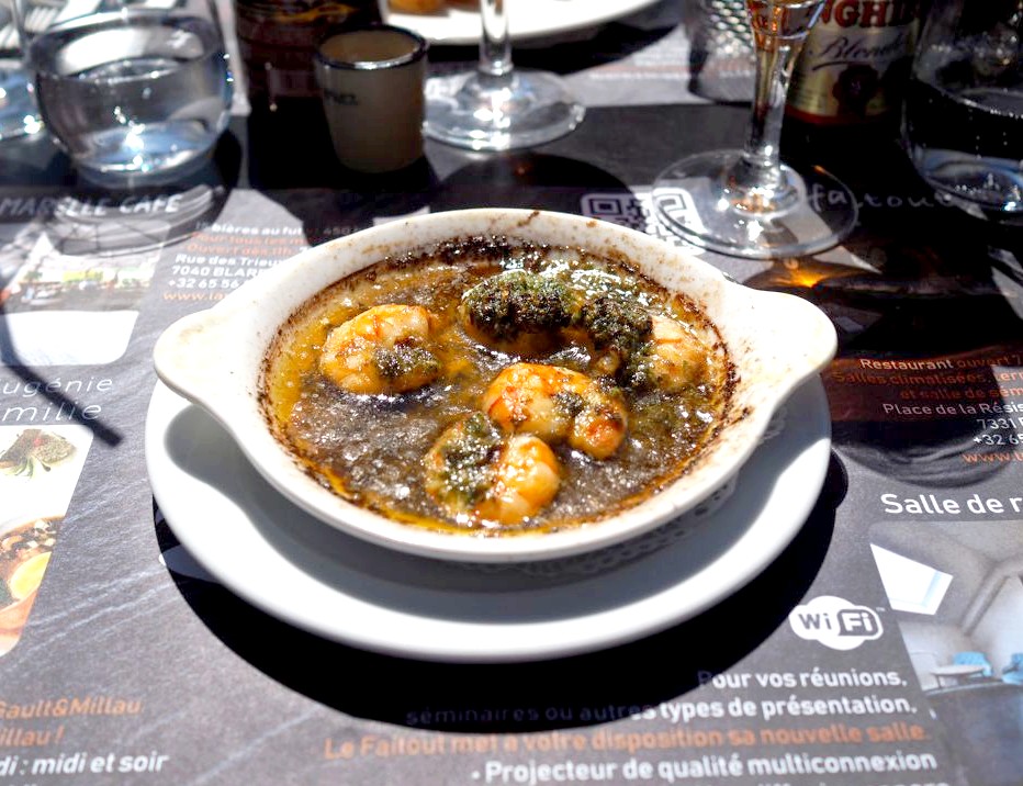 En entrée, nous nous sommes laissés tenter par deux grands classiques parfaitement exécutés, les scampis à l’ail et les croquettes aux crevettes grises faites maison.