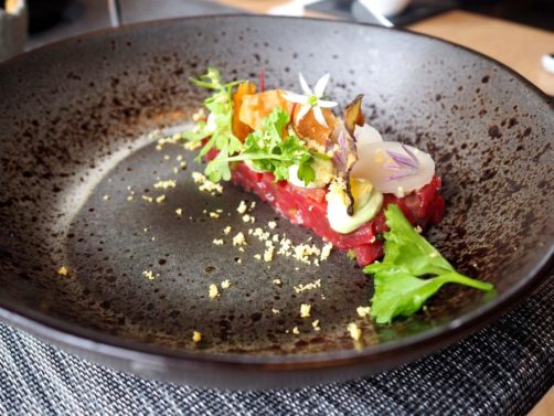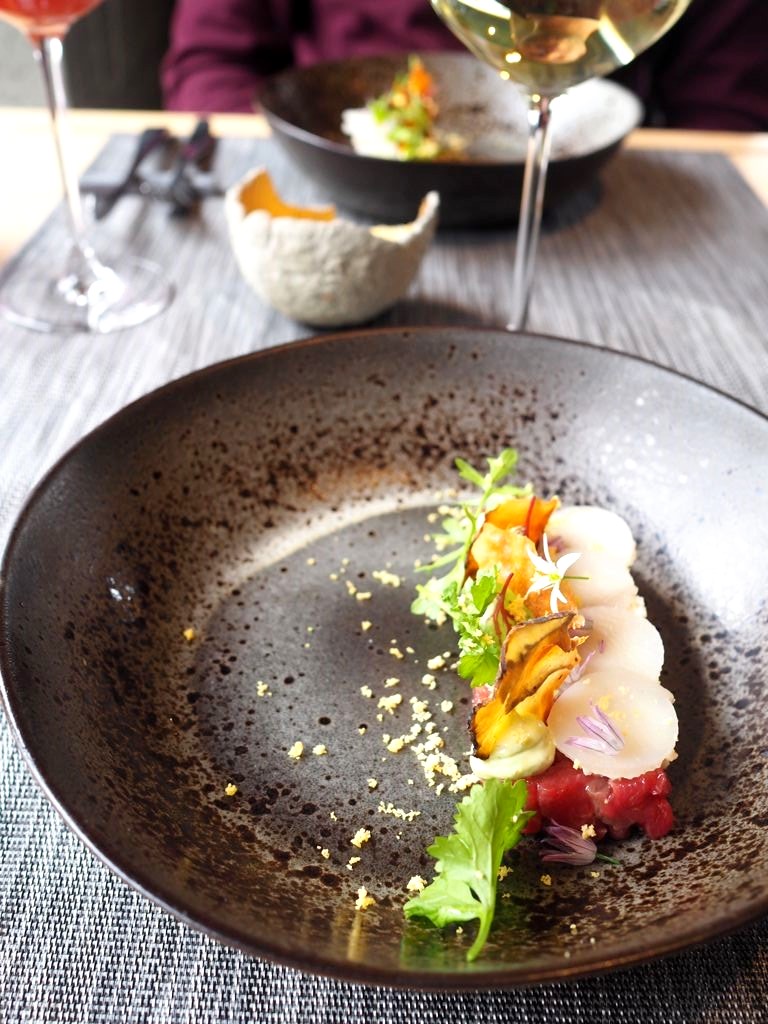 Après une série de mises en bouche prometteuses, nous avons commencé le repas avec le bœuf « Aberdeen » fumé aux herbes du jardin, oeuf bio, topinambour et mesclun « de nos jardiniers »… Une préparation délicatement parfumée, pour commencer en beauté ce menu.