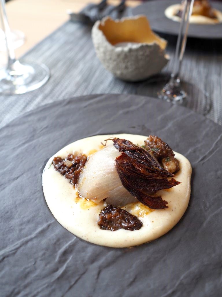 Nous avons ensuite continué avec une surprenante préparation à base de morille, grattons de ris de veau, pomme de terre, et oignon de Roscoff. Un plat vraiment gourmand, qu’on mangerait limite à la cuillère…