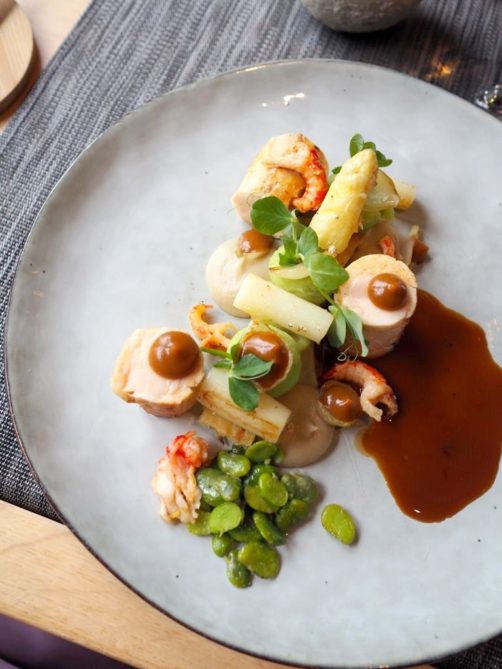 Après ce sans faute en entrées, nous sommes passé au plat principal avec la volaille de la Ferme Chaussée aux écrevisses pattes bleues, asperges blanches de Malines, mousse à l’ail des ours (une tuerie), safran de Cotchia et petits pois des marais. Une très belle association de saveurs, à nouveau bien de saison.