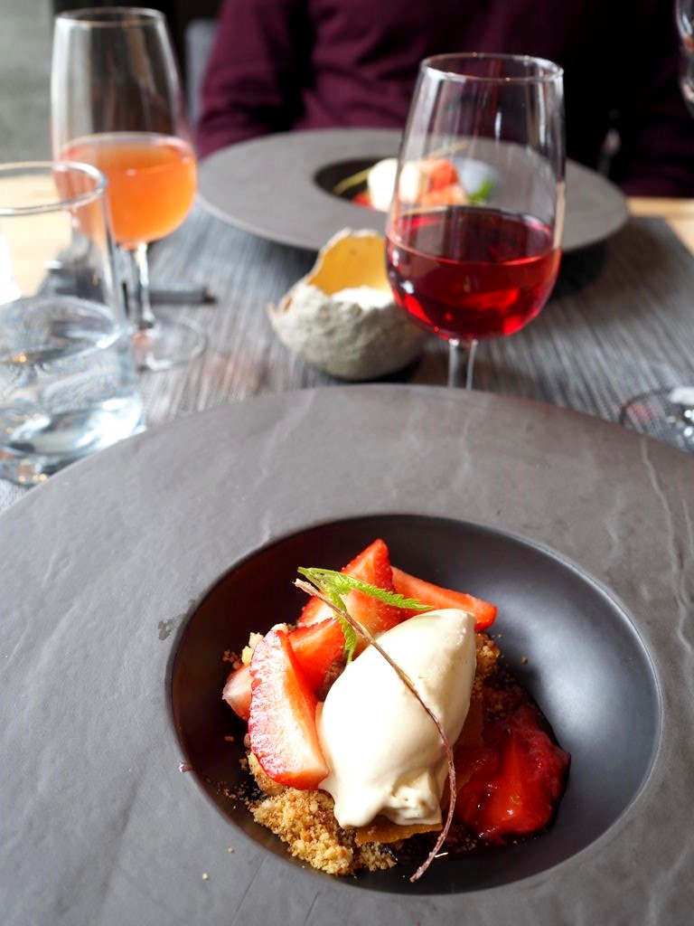 En dessert, nous avons terminé le repas avec l’inspiration sucrée saisonnière, avec ce jour-là une belle préparation à base de fraises locales, de Liberchie, puisque nous étions en pleine saison, accompagnées d’une glace à la crème brûlée. Pour ceux qui préfèrent le fromage, sachez que le Mont-à-Gourmet propose également un plateau de fromages 100% wallons de la Ferme Depape, servi sur un chariot à fromage en salle.