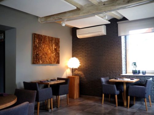 Le restaurant, situé sur la place du village, existait déjà depuis de nombreuses années. De l’extérieur, l’aspect assez classique de la bâtisse ne laisse pas présager l’intérieur ultra-moderne et épuré (et spacieux, avec un étage et salon privatif).