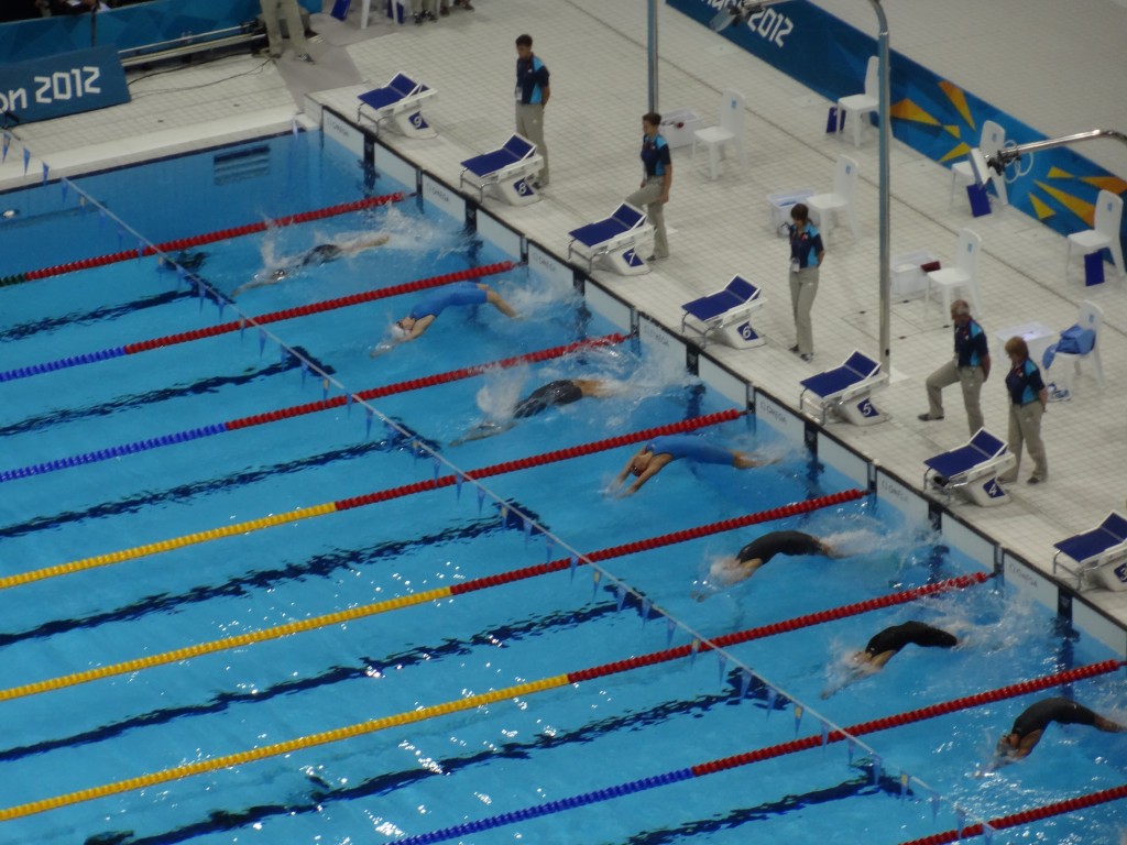 9:30, direction maintenant l’Aquatics Centre pour notre compétition de natation qui démarre à 10:00. Bâtiment très design et imposant! Après d’innombrables marches, on atteint enfin notre place… une chose est sure, il ne faut vraiment pas avoir le vertige!! Point de vue dress code, c’est le total look Union Jack qui fait fureur dans les tribunes remplies bien évidemment de supporters britanniques… pas très évident pour les quelques supporters belges, français, chinois ou autres de faire le poids face à eux! Personnellement, j’avais prévu le coup avec un petit nail art Union Jack (super easy à faire en plus!), donc je me fond assez bien dans la masse, eheh!