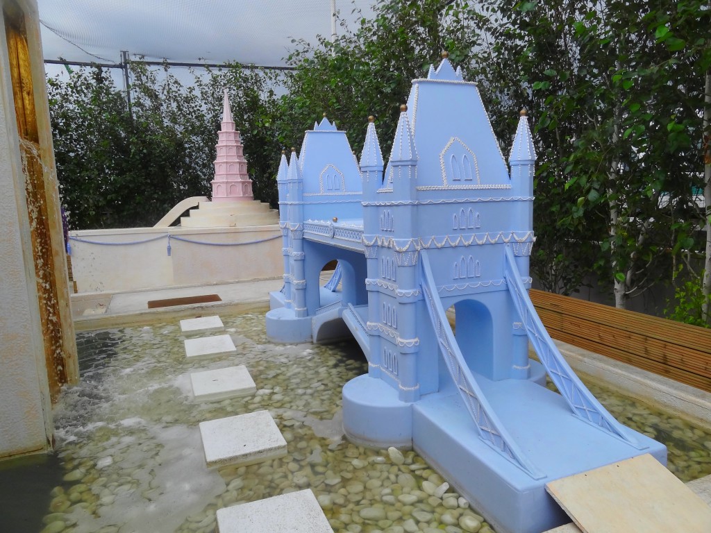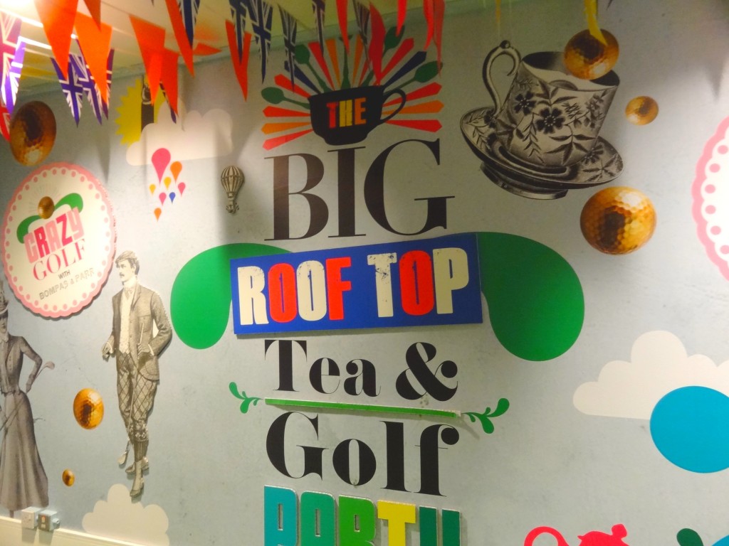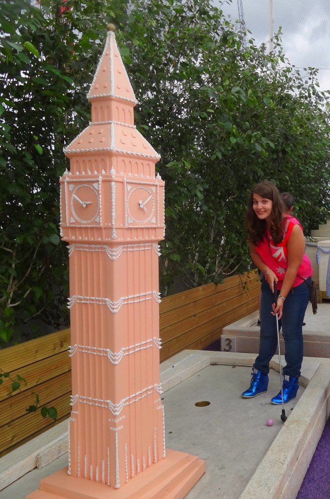 Direction le « Crazy Golf with Bompas & Parr« , deux designers très très crazy qui ont cette année créé pour la Big Roof Top Party de Selfridges un mini golf gourmand sur le thème des 9 merveilles de Londres. Kitsch comme j’aime, et tout ça pour 6£ seulement! On se croirait un peu dans l’univers de Charlie et la Chocolaterie. Même si la pluie nous a rejoint en milieu de partie, c’est une chouette activité, que je vous recommande si vous cherchez quelque chose à faire d’original dans Londres!