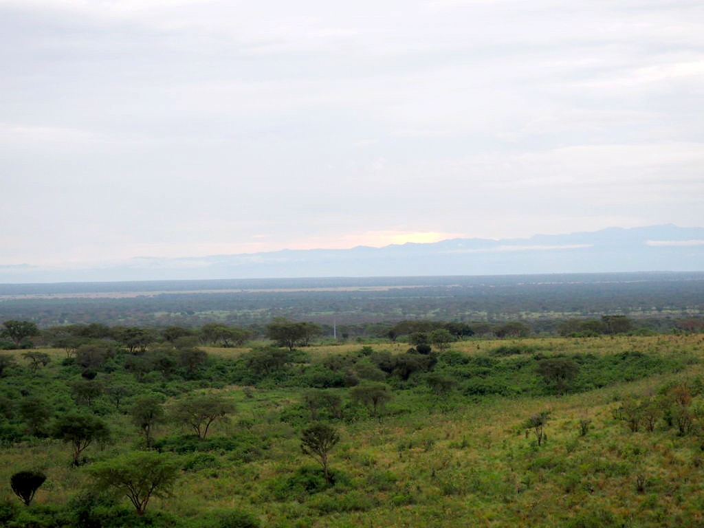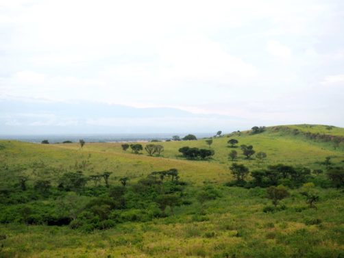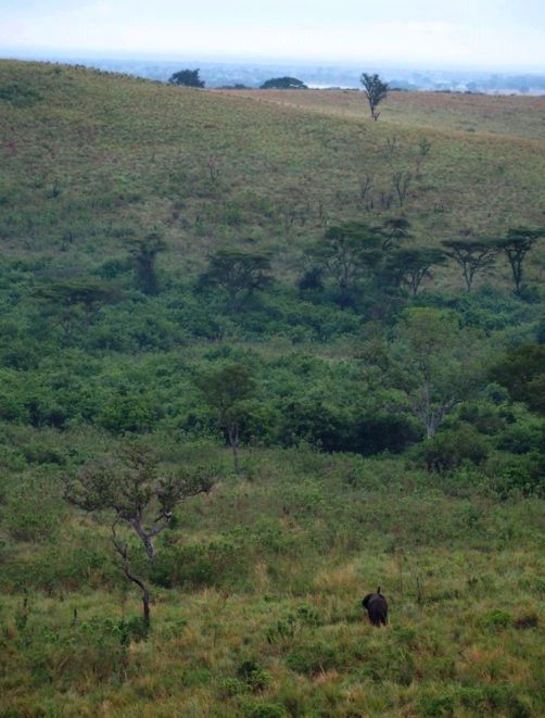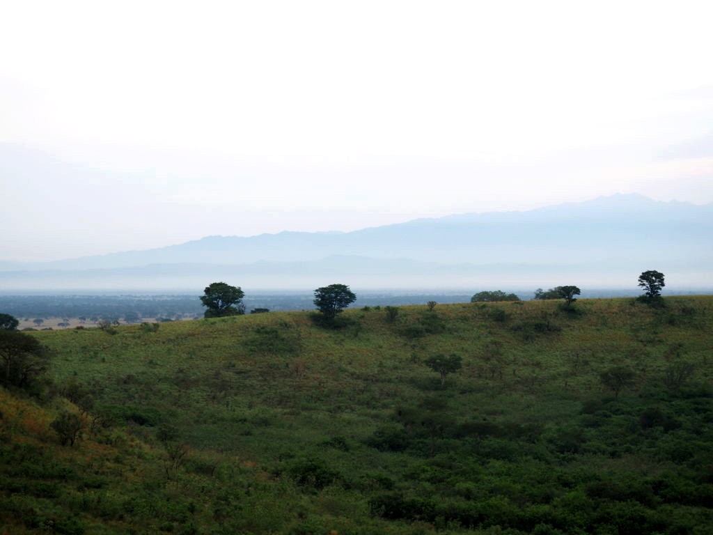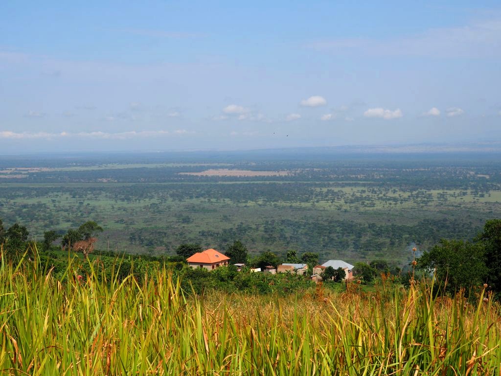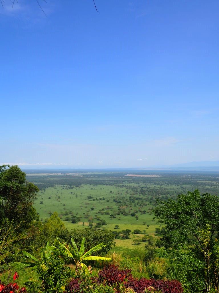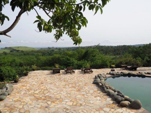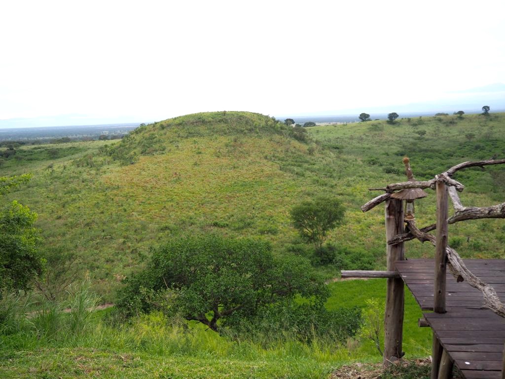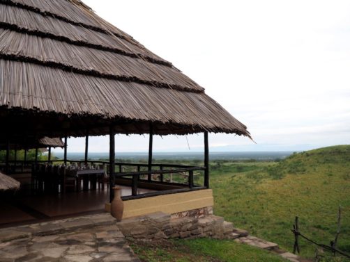 Ce matin-là, nous restons dans le coin pour visiter quelques lodges : d’abord la Kyambura Volcanoes Lodge non loin de là (avec également une belle vue sur la savane)…