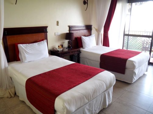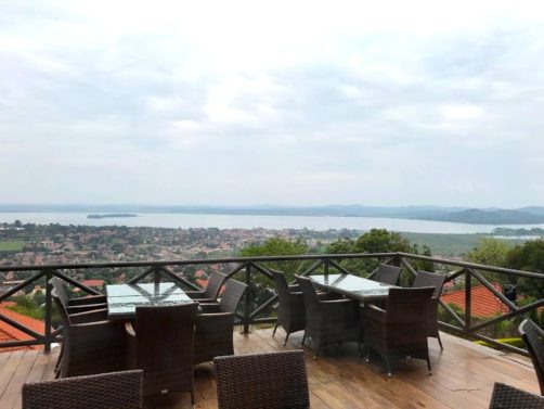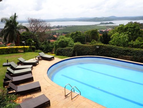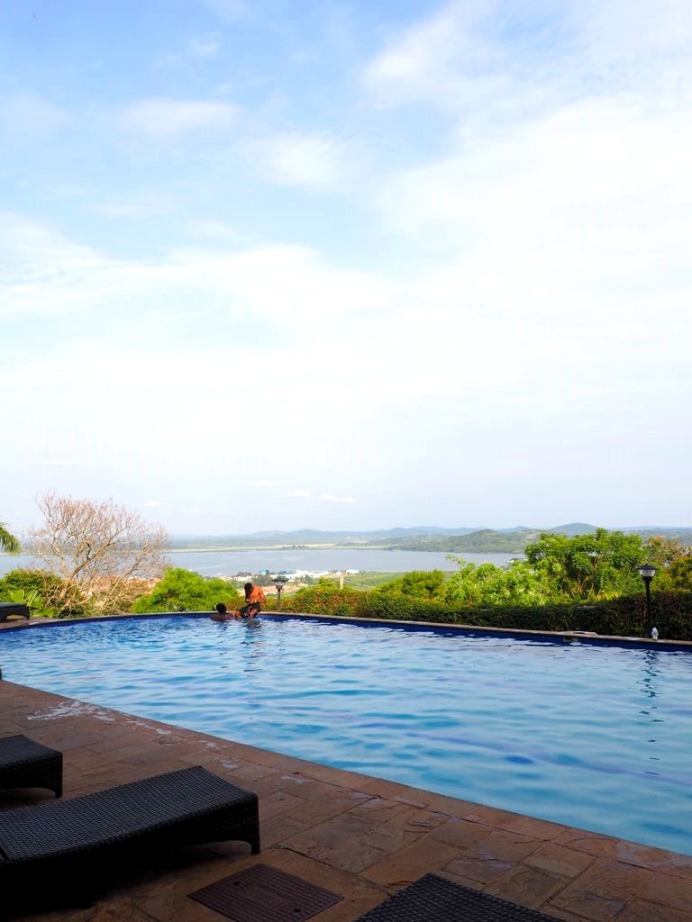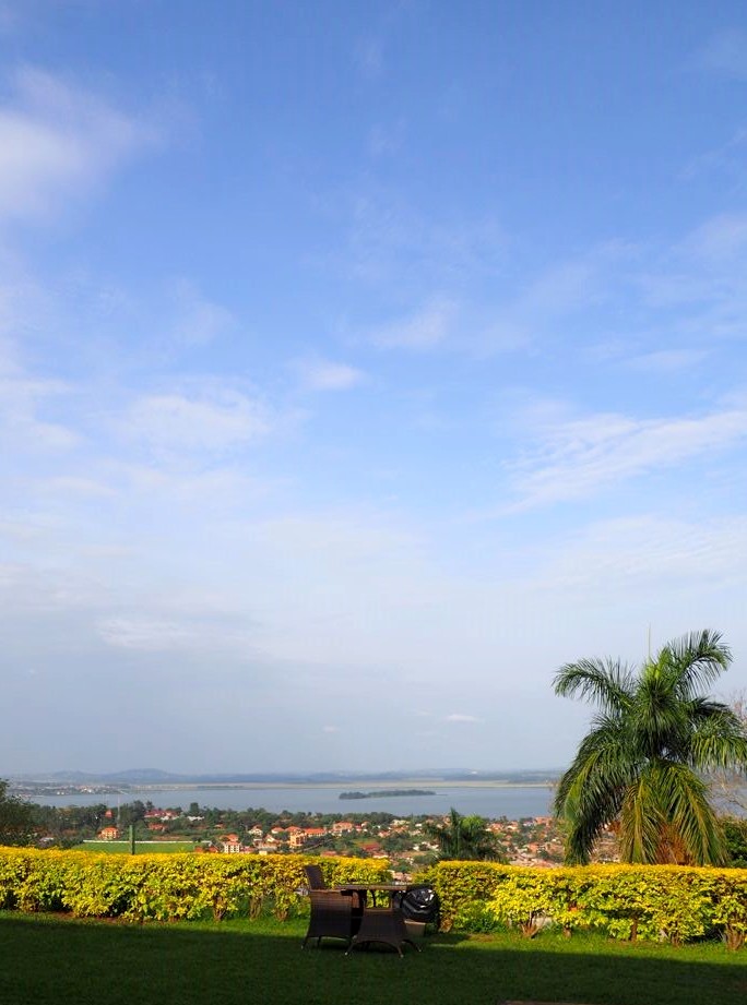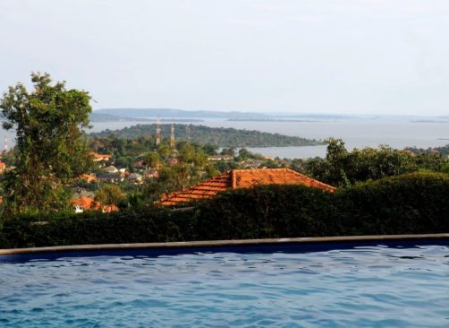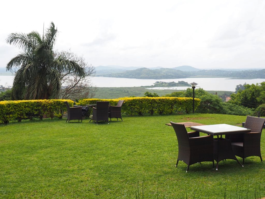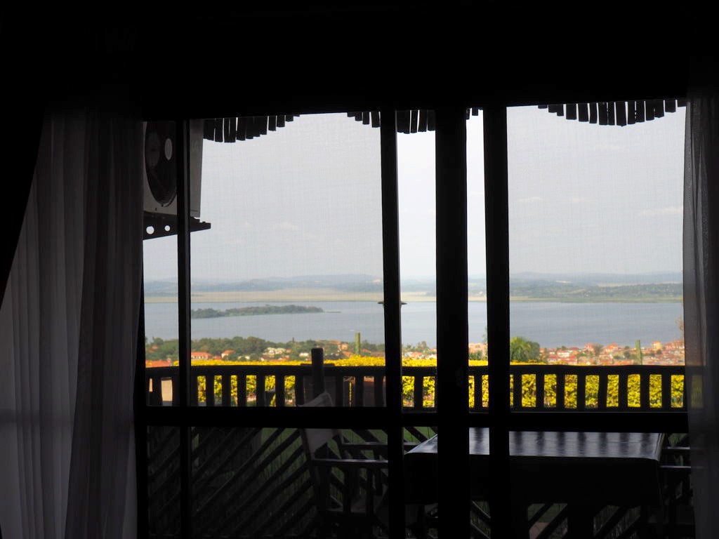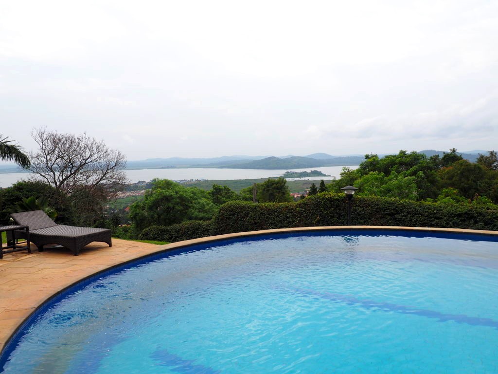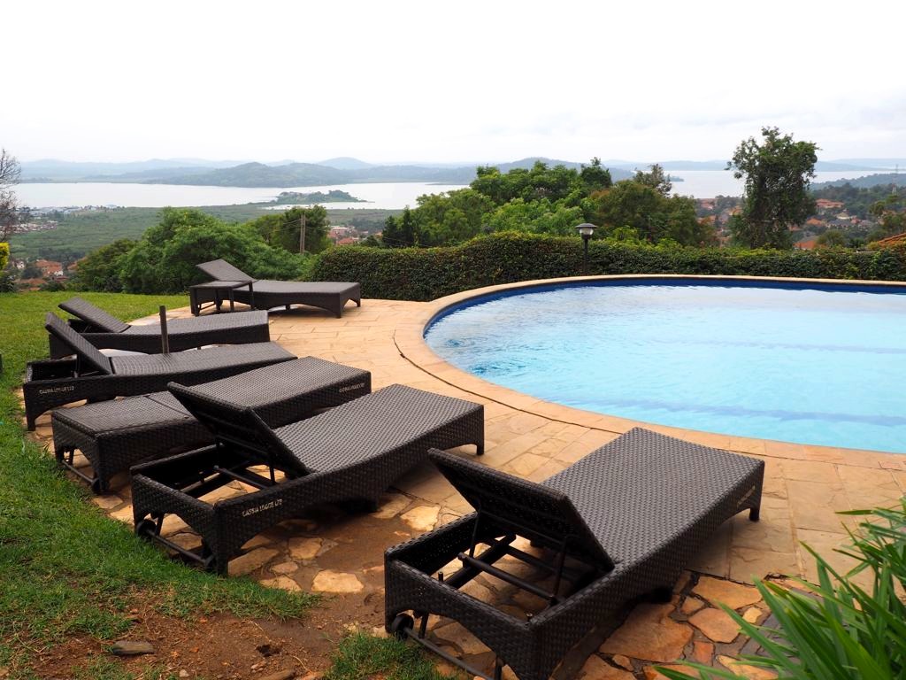 Notre hôtel, le dernier du voyage, est le Cassia Lodge dans les hauteurs de Kampala. C’est un hôtel que j’ai beaucoup aimé, très bien entretenu, avec une piscine avec vue de dingue sur le lac Victoria. C’est fou de se dire que de l’autre côté c’est le Kenya et la Tanzanie !