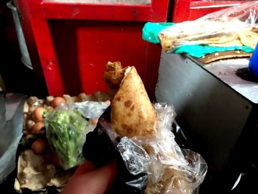 Nous parcourons les étals de fruits et légume avant de nous faufiler dans la partie « intérieure » du marché entre poulets vivants et carcasses de viande. Enfin, on trouve un petit stand de Rollex ! Les filles qui n’ont pas eu peur de me suivre ne regrettent plus du tout de l’avoir fait ! Pour quelques cents seulement, on se régale d’un gros Rollex cuit devant nous ! C’est ce genre d’expérience que j’aime en voyage !
