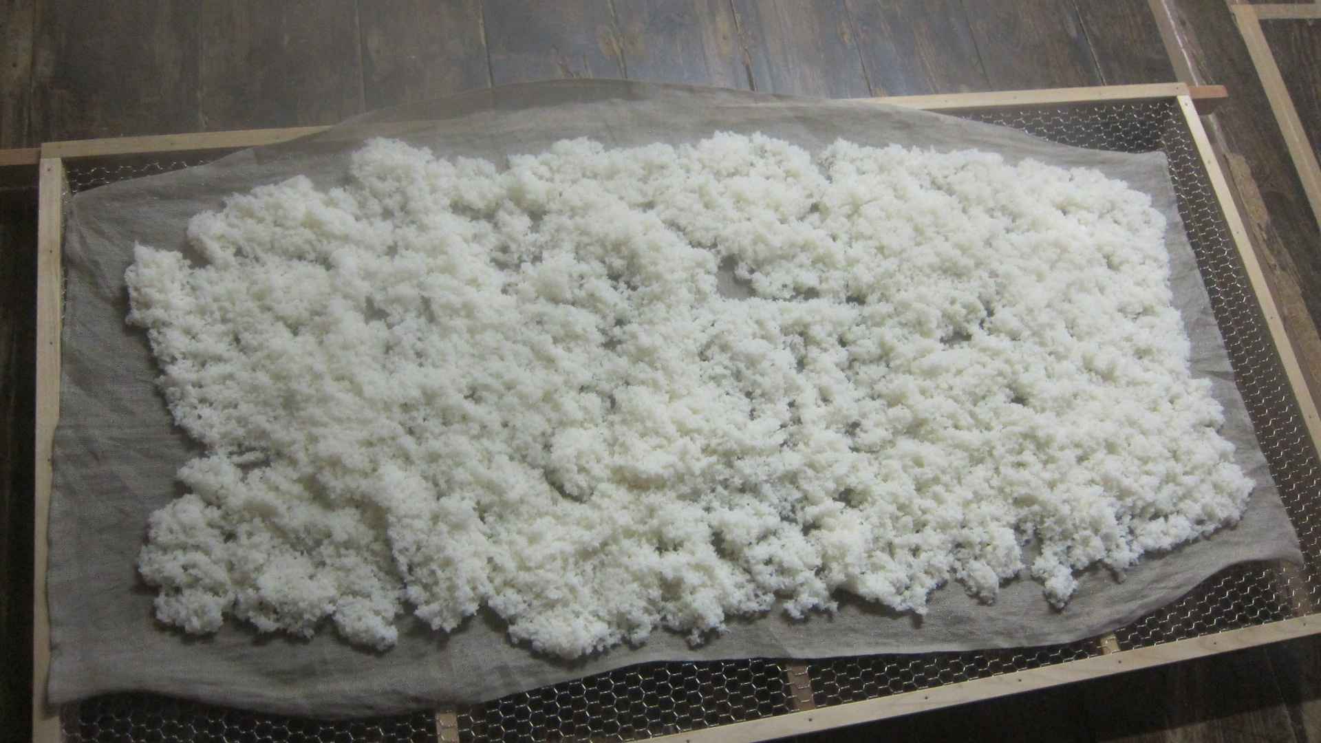C’est alors que le Toji fait toute la différence, puisqu’il doit réaliser le « koji » (le riz cuit saupoudré de koji-kin utilisé comme agent de saccharification – il faut retourner le riz toutes les 3 heures pendant 48h!), puis activer les levures et enfin réaliser le processus de fermentation. En fin de fermentation, le saké a entre 20 et 22 degrés d’alcool.