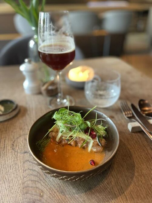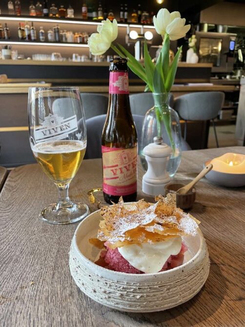 Si vous cherchez une adresse qui sort du lot parmi toutes les brasseries de Damme, je vous recommande le restaurant Mout, un « bistrobar » noté 13,5/20 au Gault&Millau. Le midi, ils proposent un lunch 3 services raffiné à 38€ (ou 32€ pour 2 services, prix 2023). Ils jouent beaucoup sur les combinaisons de saveurs originales : ça vaudrait presque un restaurant étoilé. Le soir, le restaurant propose une formule différente, avec des plats à partager. Bon choix de bières locales (mais malgré le look du resto, il ne s’agit pas d’une brasserie).