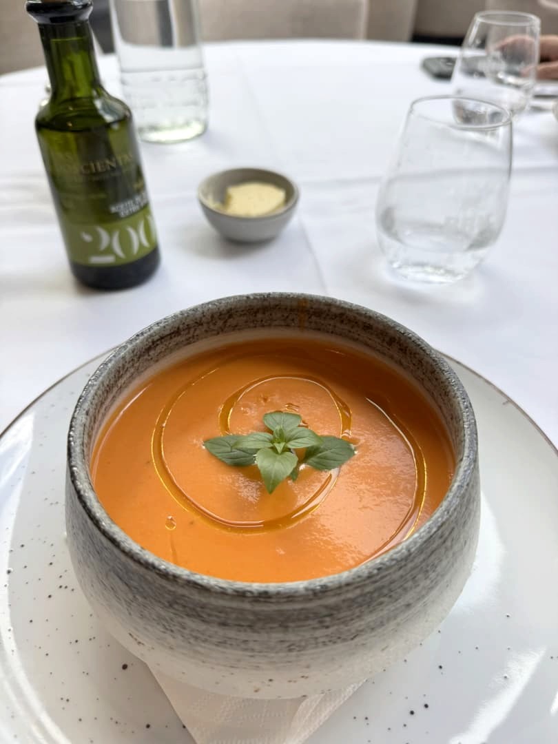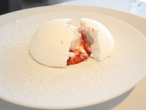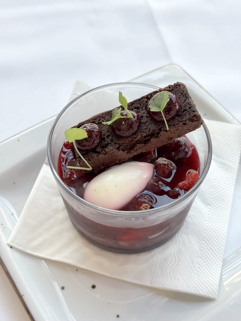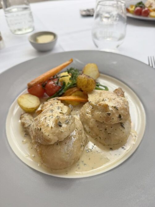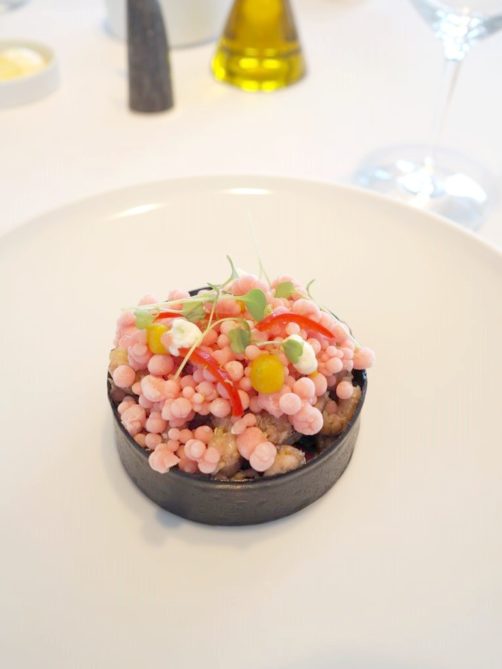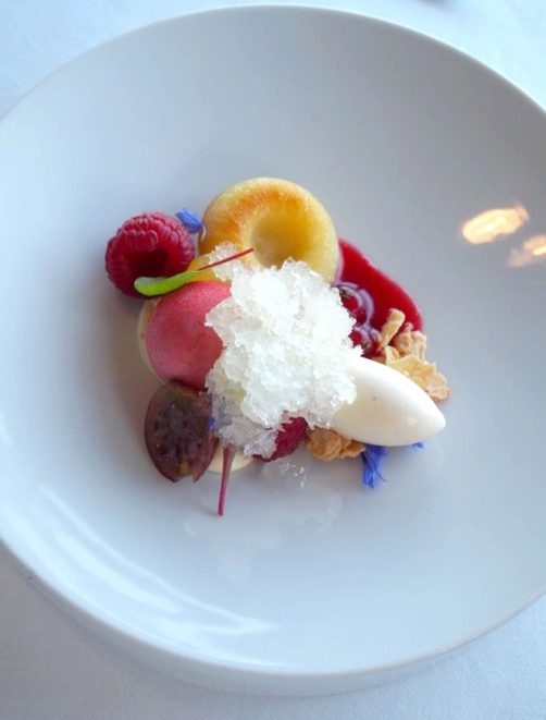 J’ai eu un énorme coup de cœur pour l’entrée du menu, sorte de version revisitée par le chef Bart Desmidt de la très classique tomate crevettes : les crevettes grises épluchées main sont ici accompagnées de pastèque (qui remplace la tomate, super idée !), piccalilli et sésame. Des saveurs légèrement exotiques et des textures hyper contrastées (avec une partie gelée, parfait avec ce temps) font de ce plat un des meilleurs que j’ai mangé depuis longtemps. Le poulet fermier avec son pain naan et le dôme framboises, fleurs de sureau, sablé breton et meringue en dessert (avec à nouveau un super jeu de textures) ont réussi à tenir le niveau. Le chef vient régulièrement faire le service à table, c’est également très agréable.