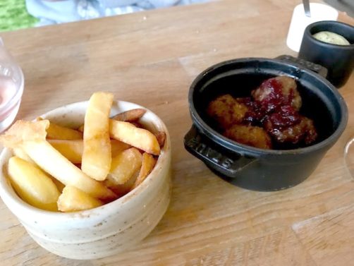 Omelette, boulettes suédoises avec frites et un énorme rôti de porc Orloff, avant de passer au sucré avec une énorme planche de petites douceurs en guise de dessert.