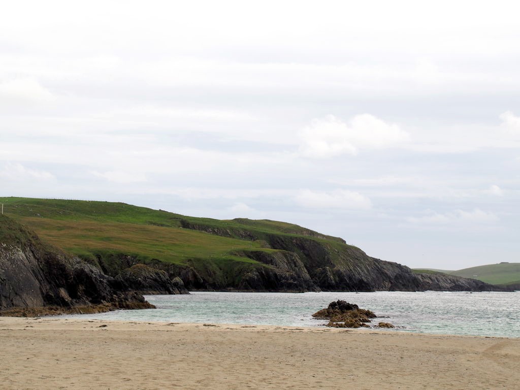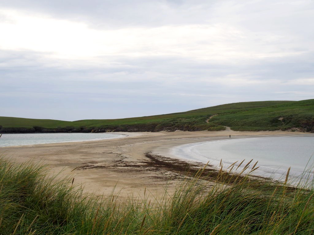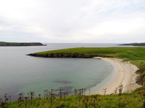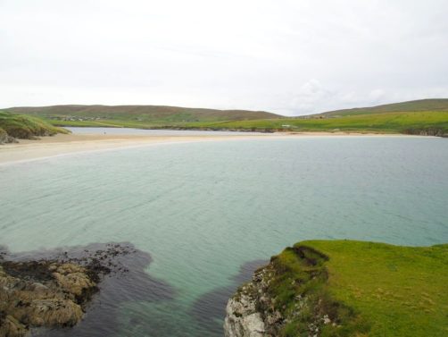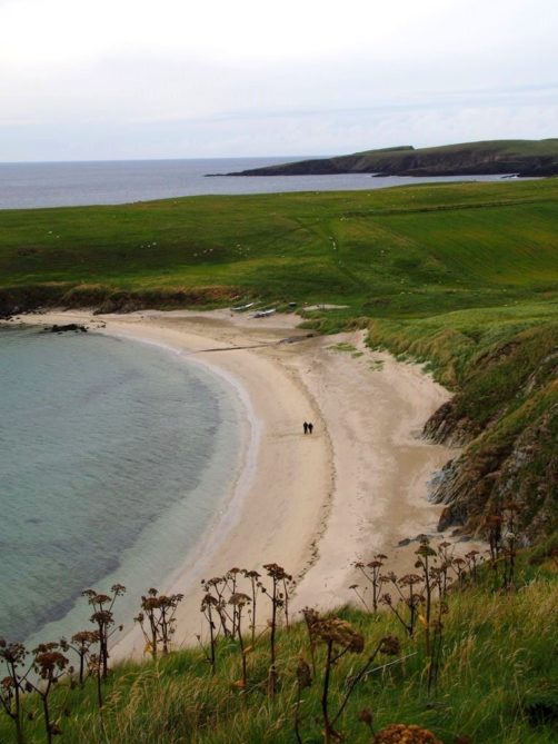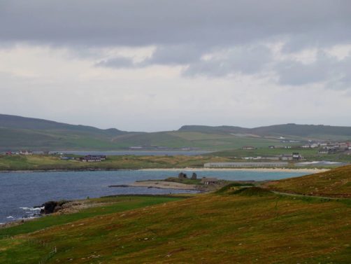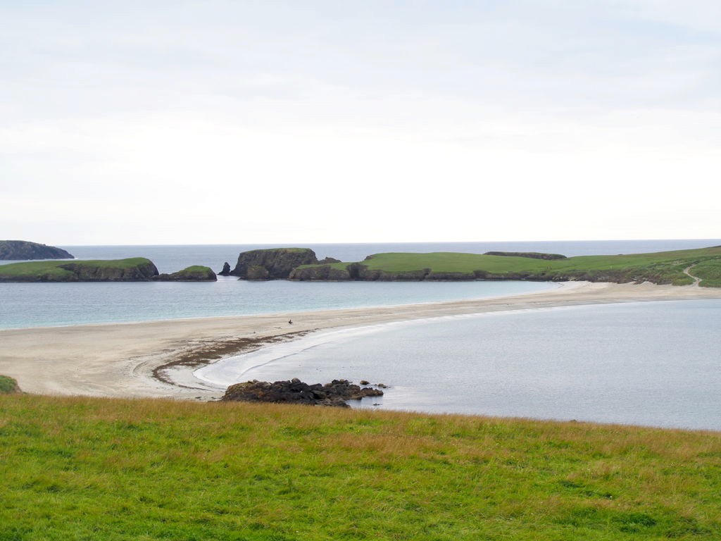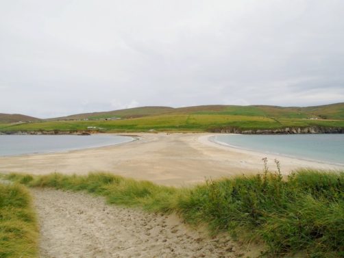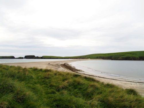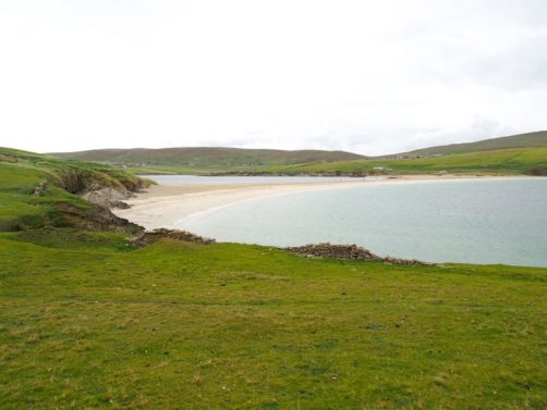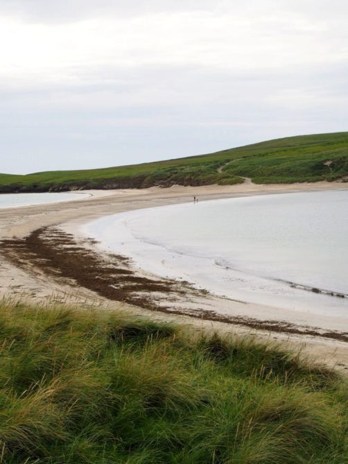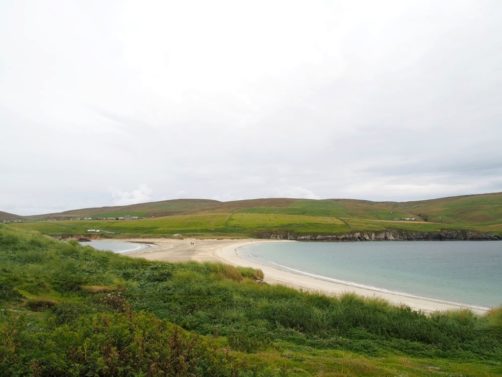 Quelques kilomètres plus loin se trouve l’un des plus beaux endroits des Shetland, St Ninian’s Isle, une île connectée à Mainland par un isthme de sable ou « tombolo ». Malheureusement le ciel était gris lorsque nous y sommes allés, mais lorsqu’il fait beau l’eau est vraiment turquoise et translucide…