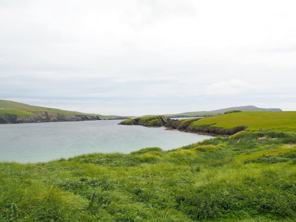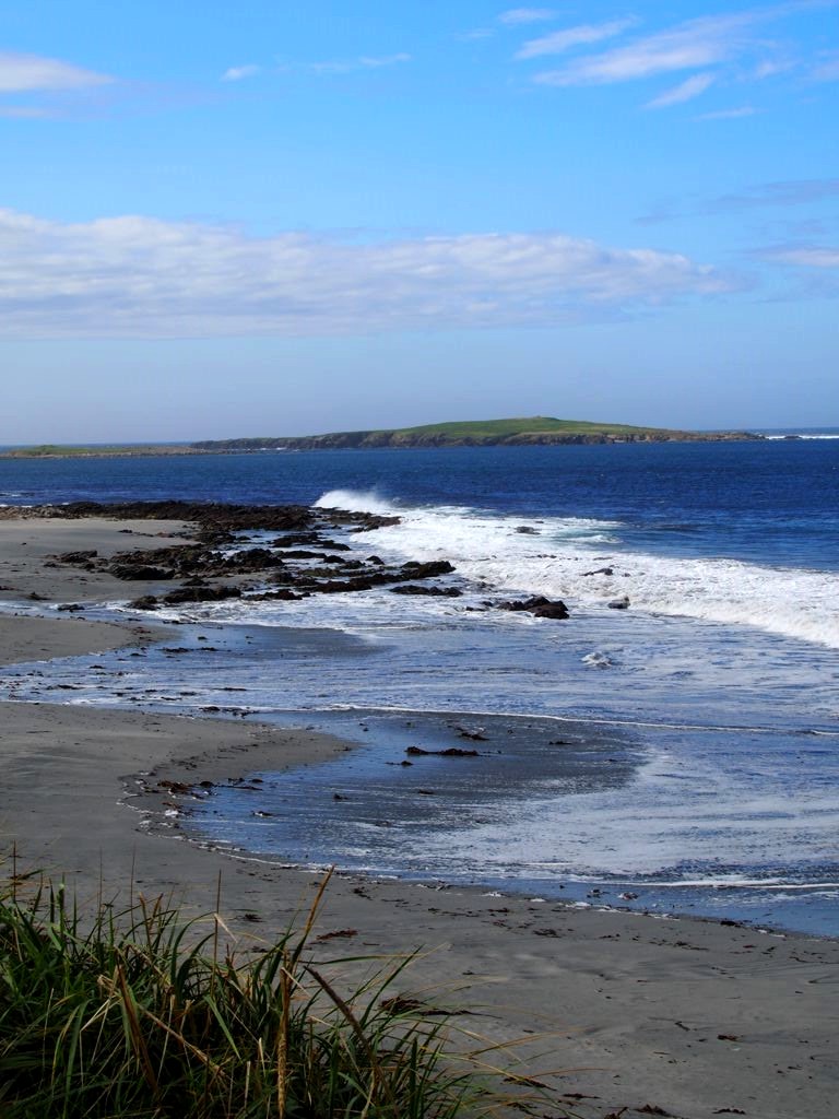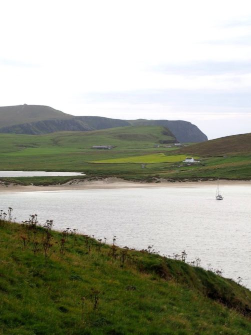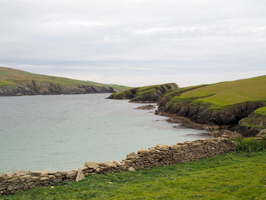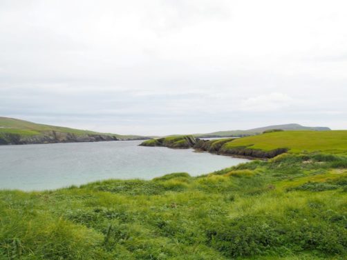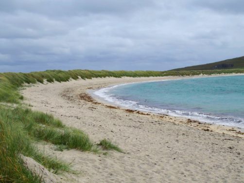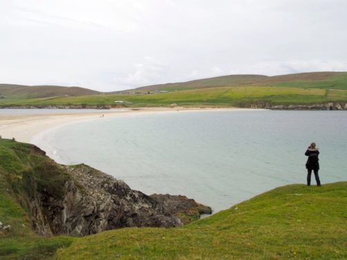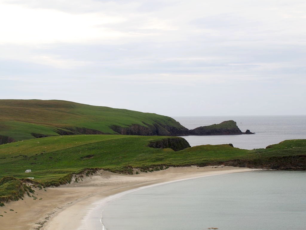 Quelques kilomètres plus loin se trouve l’un des plus beaux endroits des Shetland, St Ninian’s Isle, une île connectée à Mainland par un isthme de sable ou « tombolo ». Malheureusement le ciel était gris lorsque nous y sommes allés, mais lorsqu’il fait beau l’eau est vraiment turquoise et translucide…