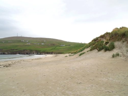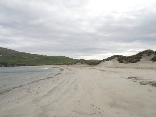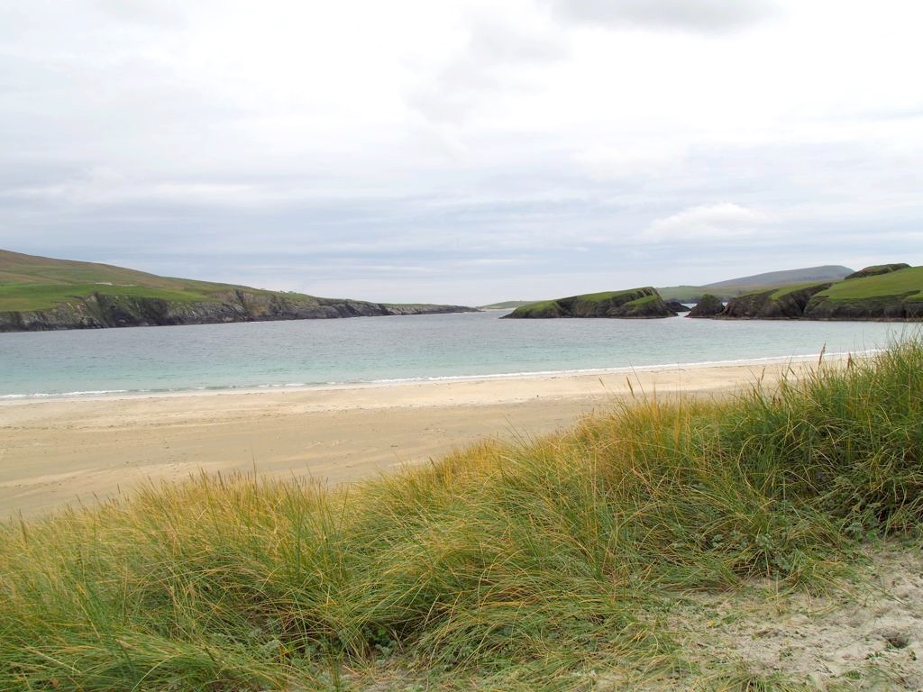 Je vous conseille ensuite de quitter la route principale en direction du Spiggie Loch et surtout de la plage de Scousburgh Sands, une magnifique plage de sable blanc entourée de dunes. Depuis la route, on peut admirer de superbes vues de la plage avec le loch en arrière-plan. Scousburgh Sands est juste en face d’une autre plage splendide mais nous n’en avons pas trouvé le nom : les localisations Google maps, il n’y en a pas beaucoup dans les Shetland…