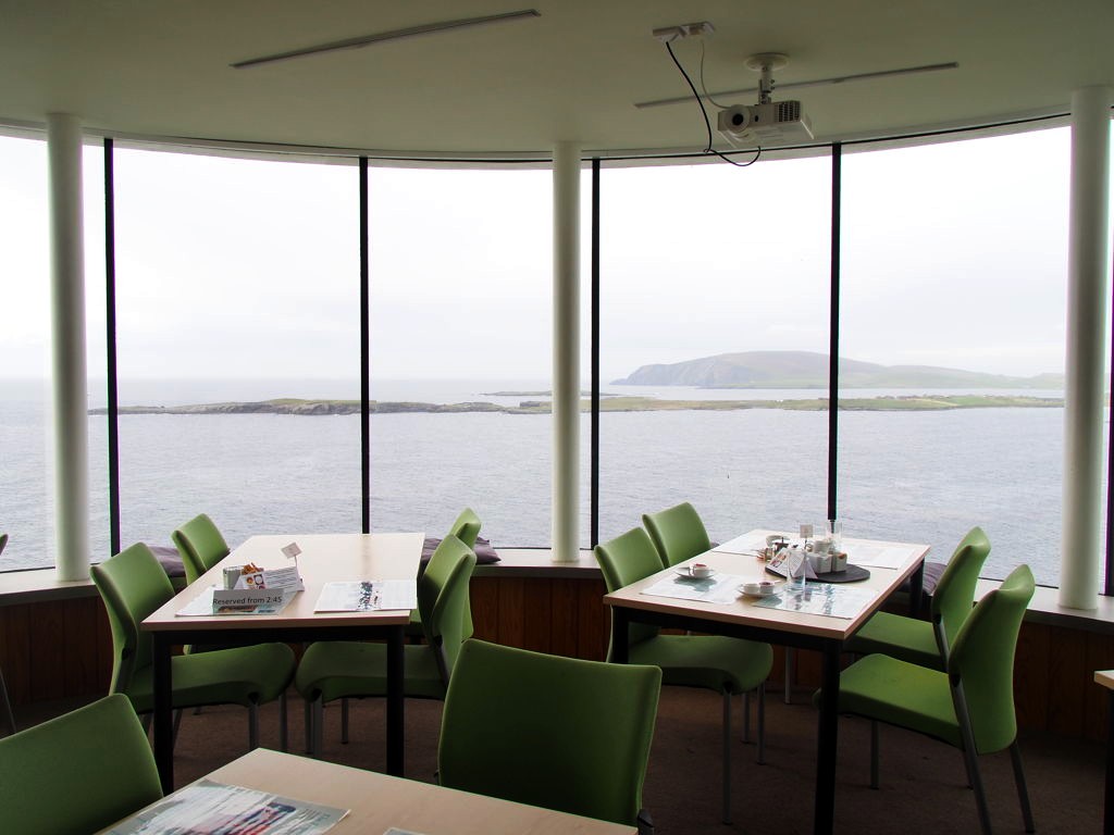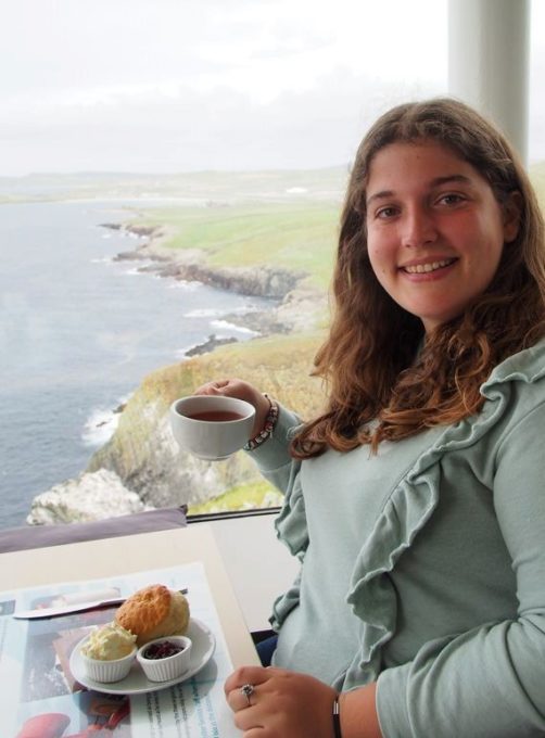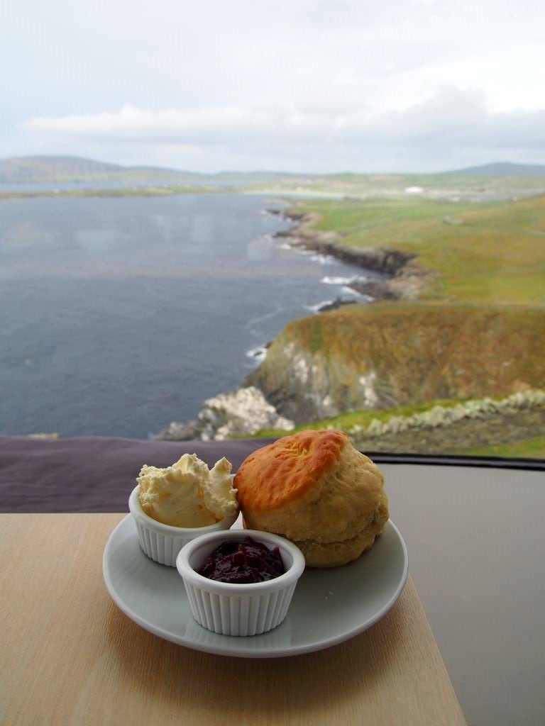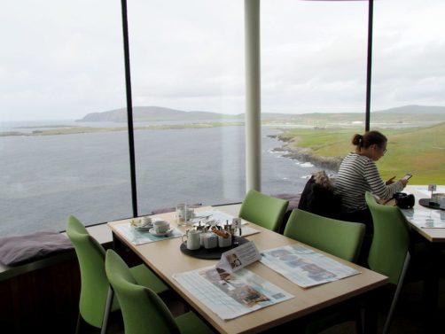 N’ayant pas encore mangé (on apprendra vite que manger aux Shetland n’est pas toujours chose aisée), nous avons tout d’abord foncé au tea room, pour un petit scone avec vue ! Le tearoom du phare offre de magnifiques vues sur les côtes et sur l’aéroport, c’est l’idéal pour se réchauffer et reprendre des forces.