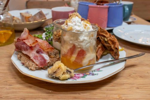 Le Boentje Café, c’est le premier café zéro déchet de Bruxelles. Dès que vous passez la porte du café, vous sentez une ambiance chaleureuse dans un endroit complètement aménagé avec des meubles, de la décoration et même de la vaisselle recyclés. Le week-end, ils proposent des brunchs qui varient bien évidement au gré des saisons. Dans un premier temps, on reçoit un assortiment de pains et craquelins accompagnés de confitures et caramel beurre salé. Côté boisson, nous avons droit à une tasse de café avec un ice tea 100% maison.