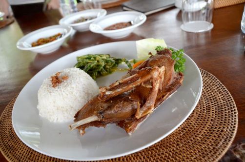 La spécialité de ce restaurant en plein air est une spécialité locale très populaire auprès des balinais : le Berek goreng, du canard croustillant, servi entier, avec plein de sauce piquante ! On mange dans des petites maisonnettes face aux rizières… Très sympa ! Et on ne peut plus « slow food » : en faisant le tour du propriétaire, vous pourrez voir les canards attendant leur heure…