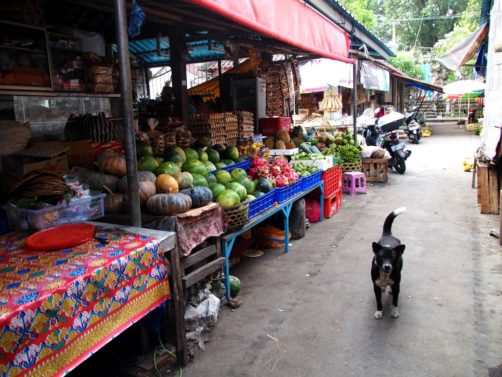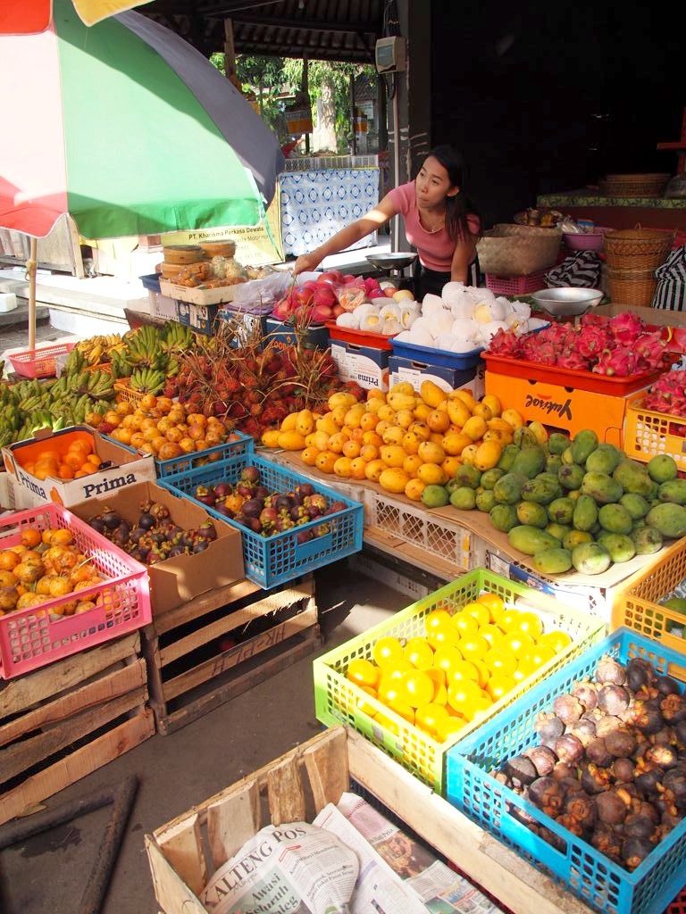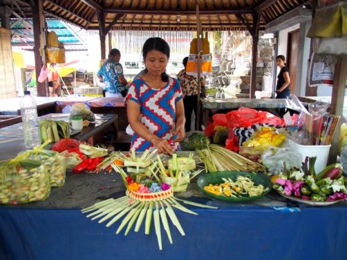 Ce ne sont pas les marchés qui manquent à Ubud ! Dans les marchés les plus touristiques, vous trouverez toutes sortes de souvenirs plus ou moins artisanaux, mais en ce qui me concerne ce sont les marchés locaux comme celui ci-dessous que je préfère. Admirer les étals de fruits et légumes, observer la fabrication d’offrandes, s’arrêter manger un bout… Si vous voulez découvrir un petit bout de la vie balinaise, c’est dans les marchés que ça se passe (la localisation du marché en photos ci-dessous se trouve sur la deuxième photo).