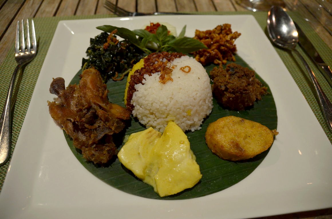 Nous y goûtons l’une des spécialités du restaurant, un plat avec du riz de trois couleurs différentes, ce qui est également très populaire dans la cuisine javanaise. Nous nous sommes régalés, avec en fond sonore de la musique live.