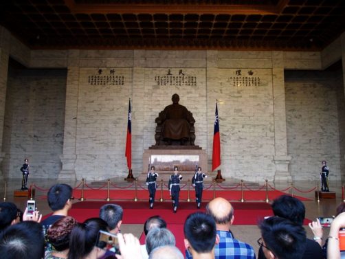 Une fois passée la East Gate, on se retrouve enfin au Chiang Kai-shek Memorial Hall, qui doit son nom au premier président de Taiwan. On se retrouve sur une énorme place entourée de plusieurs bâtiments. Le mémorial est le bâtiment du fond, où a lieu toutes les heures le changement de la garde. Sur les côtés se trouvent le National Theater et le Concert Hall. C’est vraiment grandiose !
