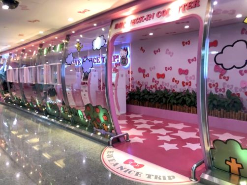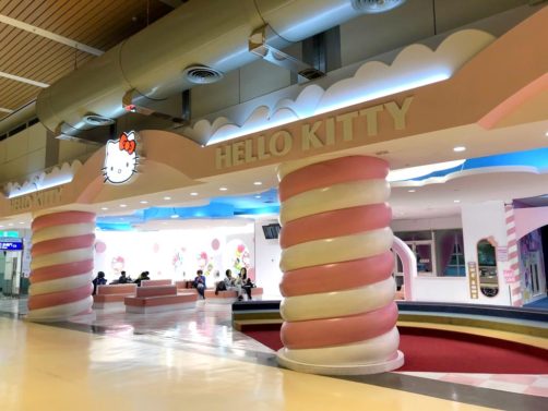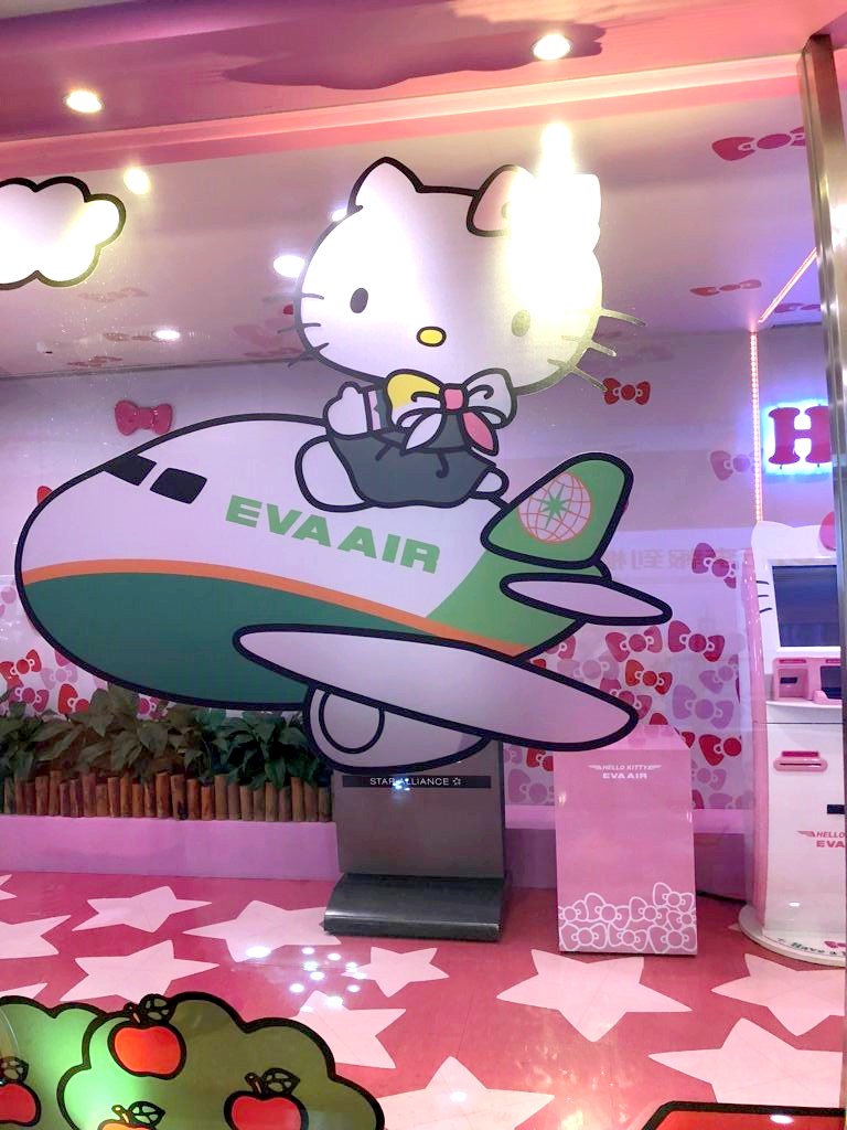 C’est dans cet aéroport qu’arrivent notamment les fameux vols Hello Kitty de Eva Air, la compagnie taïwanaise. Nous avons pris un avion de cette compagnie pour rentrer mais nous n’avons pas eu l’occasion de tester l’avion Hello Kitty : les vols Hello Kitty sont déterminés à l’avance et coûtent plus chers. Malgré tout, l’aéroport de Taoyuan reste très « kawaii », et chaque porte d’embarquement est décorée selon une thématique différente. Ne manquez pas d’aller faire un tour dans la zone Hello Kitty !