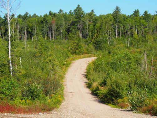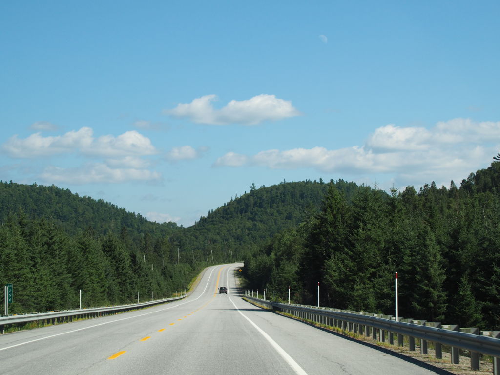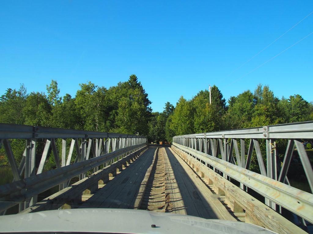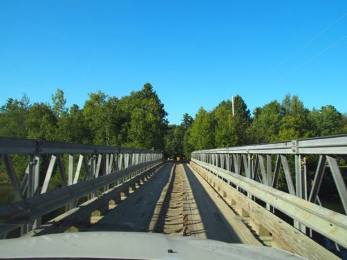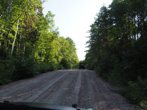 D’après ce que nous expliquera plus tard le patron du Rabaska Lodge, pour gagner du temps, les bûcherons font des percées à travers la forêt qu’ils recouvrent de troncs pour permettre aux camions d’y accéder. Les pistes sont par la suite parfois transformées en “route” (une piste de gravier). Après quelques années, les troncs restés sous la route commencent à pourrir et la route se défonce peu à peu. D’où l’état un peu chaotique et inégal des routes !
