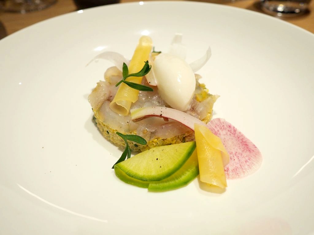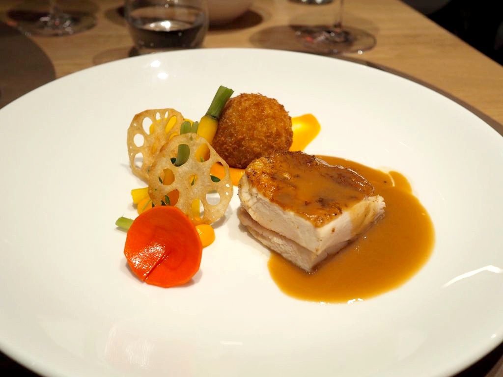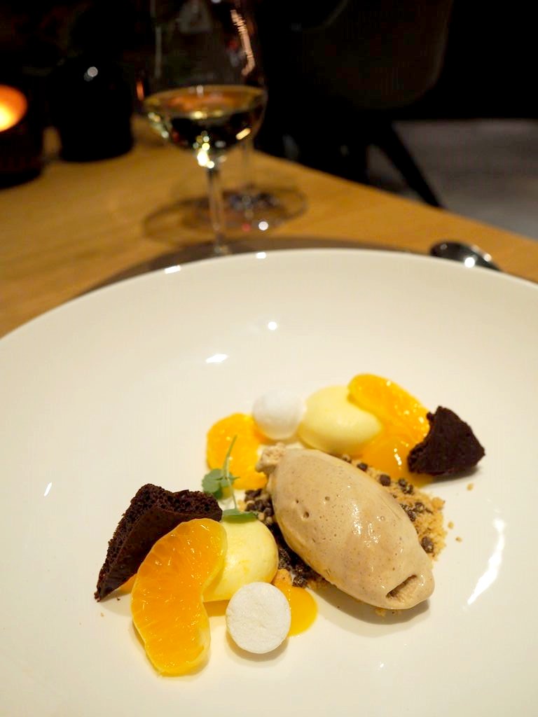 Lors de notre visite en décembre, nous avons débuté le repas avec la lotte marinée, bergamote et légumes frais (mon plat préféré, léger et original). Nous avons ensuite poursuivi avec le poulet de 100 jours, velouté, carottes et vadouvan. Enfin, en dessert, nous avons dégusté une préparation à base de mandarine, chocolat noir et biscuits.