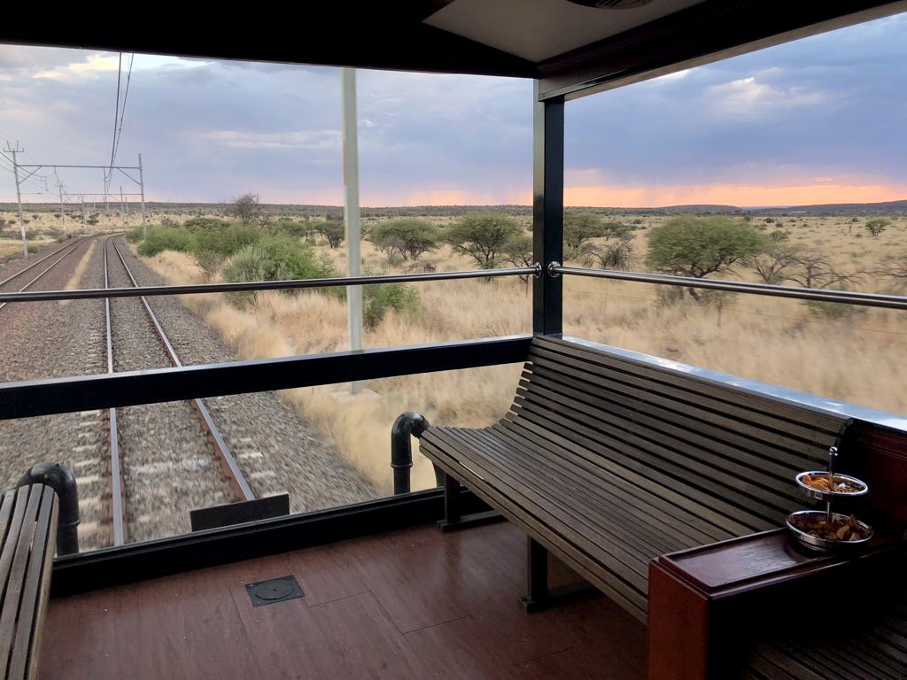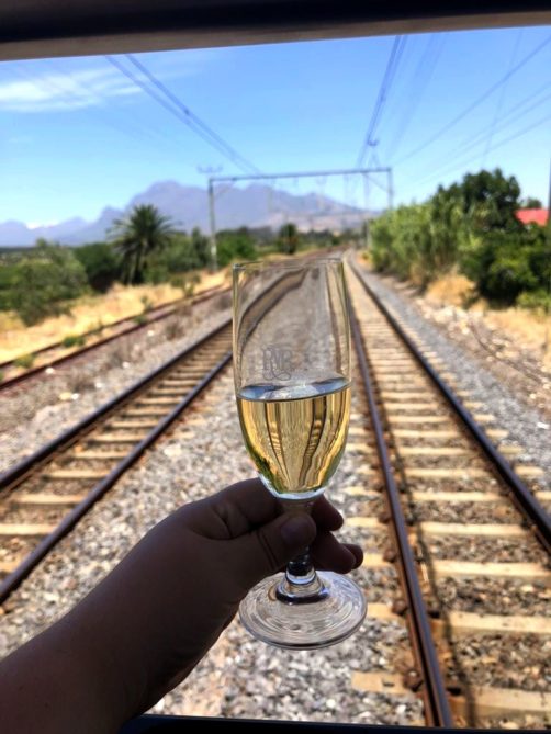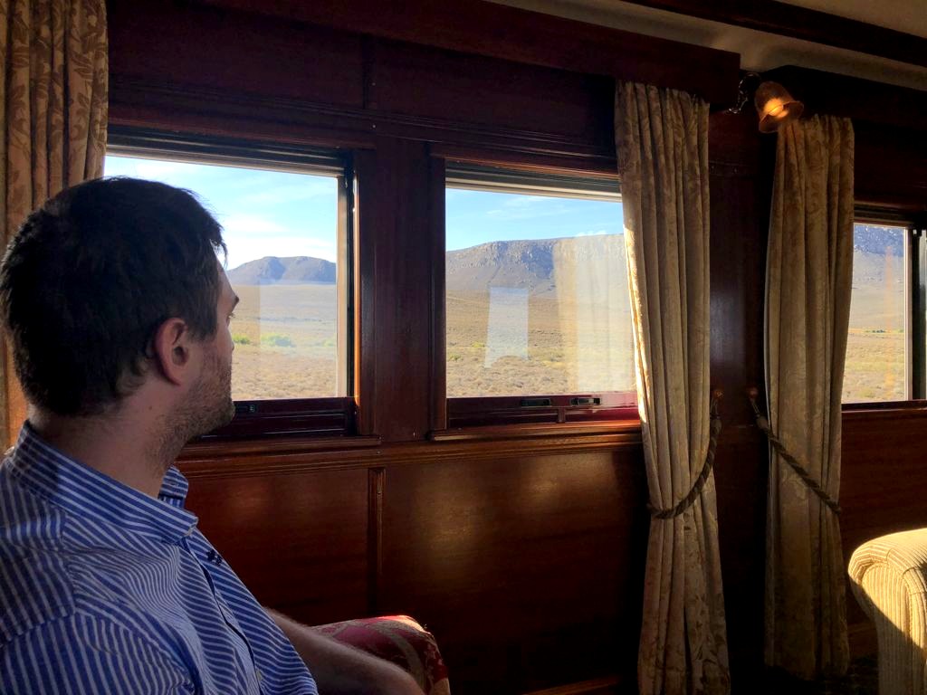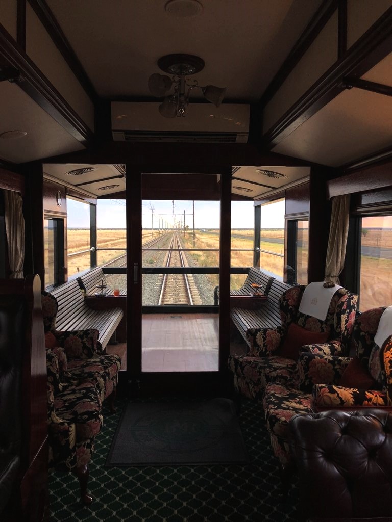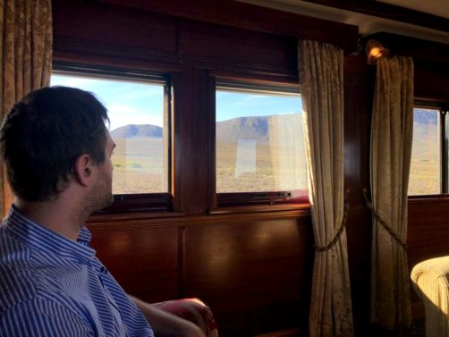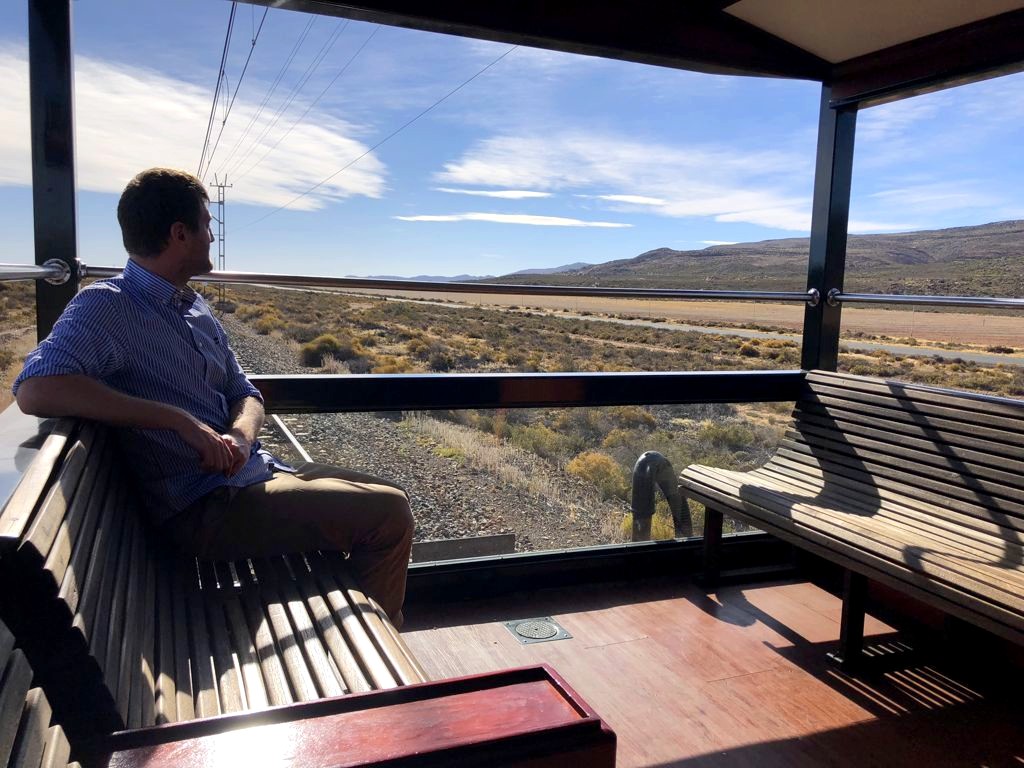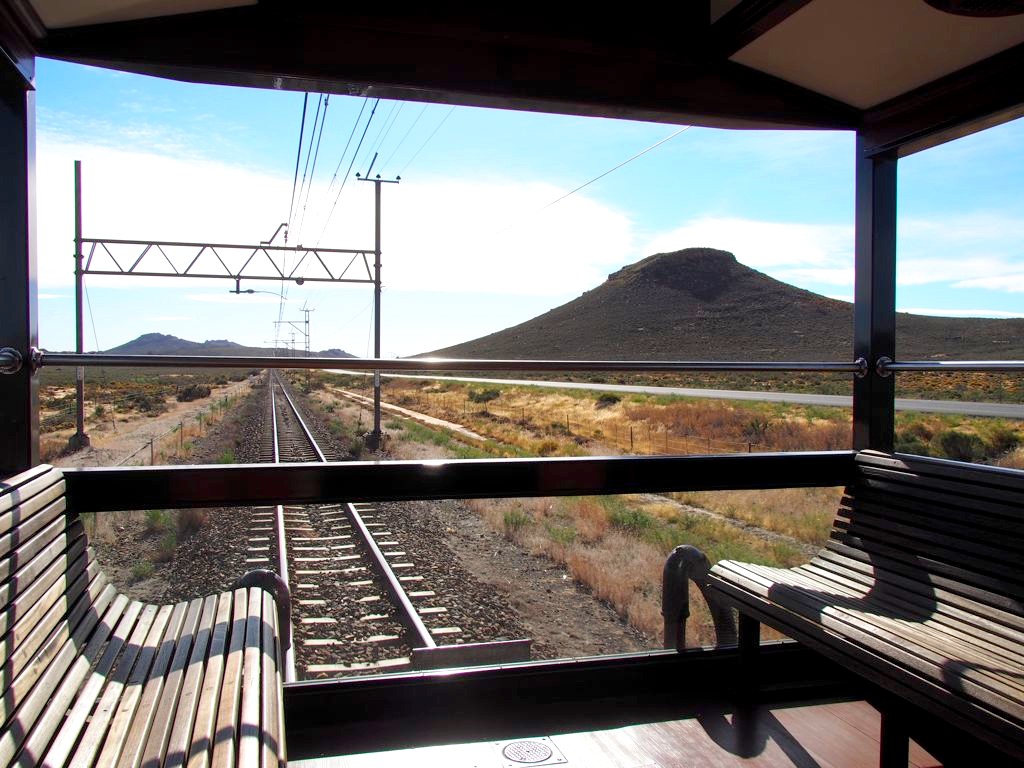 11h. Nos noms sont appelés un à un, et nous sommes escortés jusque dans notre cabine. Juste après, le train part de la voie 23 de la gare du Cap. Impossible de rester dans notre suite, nous avons envie d’explorer le train ! Après avoir fait le tour du propriétaire, nous trouvons ce qui sera notre place pendant l’essentiel du trajet : le wagon d’observation à l’arrière du train ! Quelques minutes plus tard, un nouveau verre de bulles nous est servi. Nous prendrons donc l’apéritif tout en disant au revoir au Cap (on aperçoit encore la Table Mountain), et en faisant la connaissance d’autres passagers.