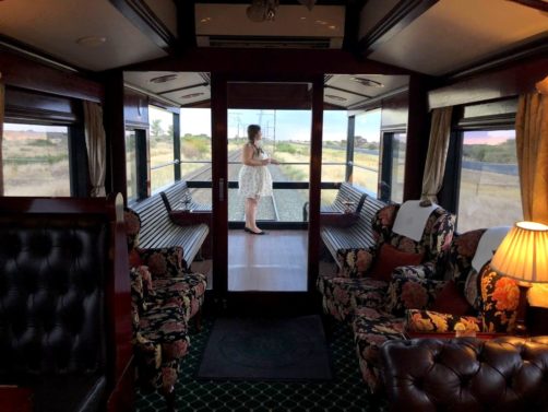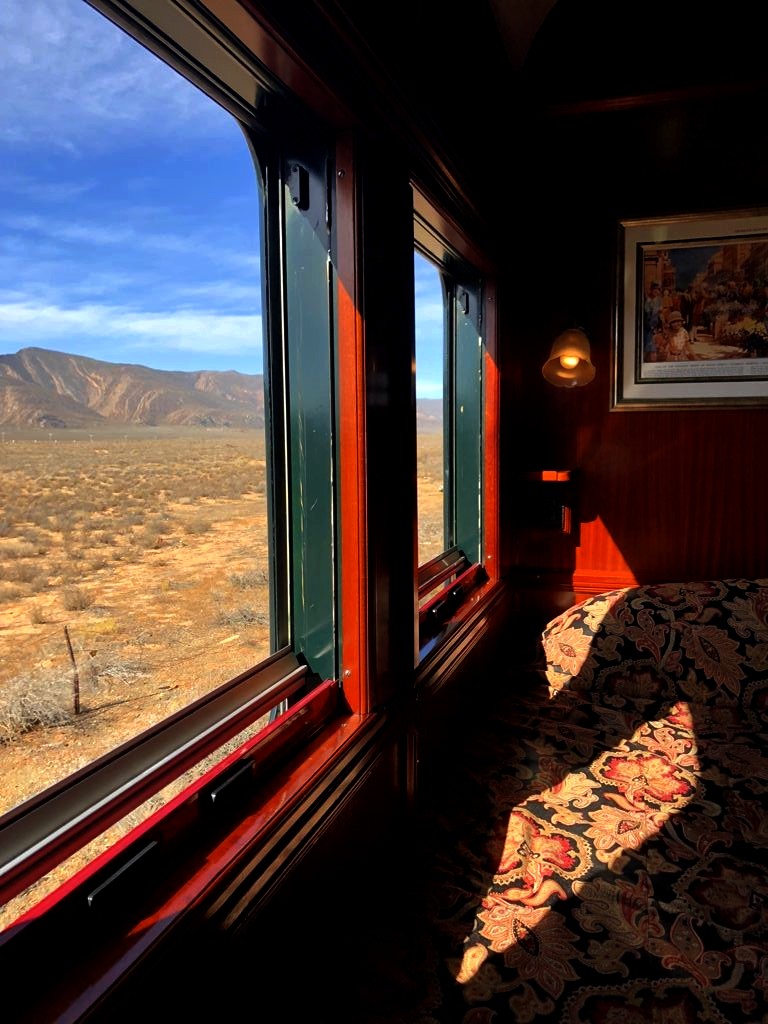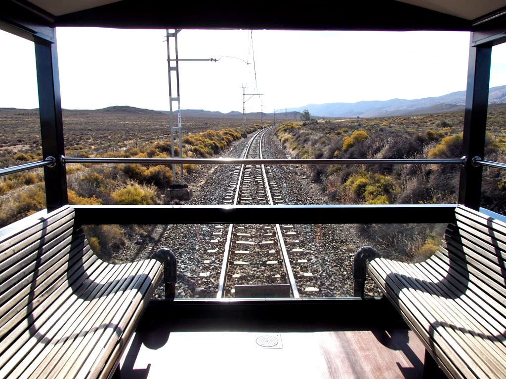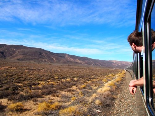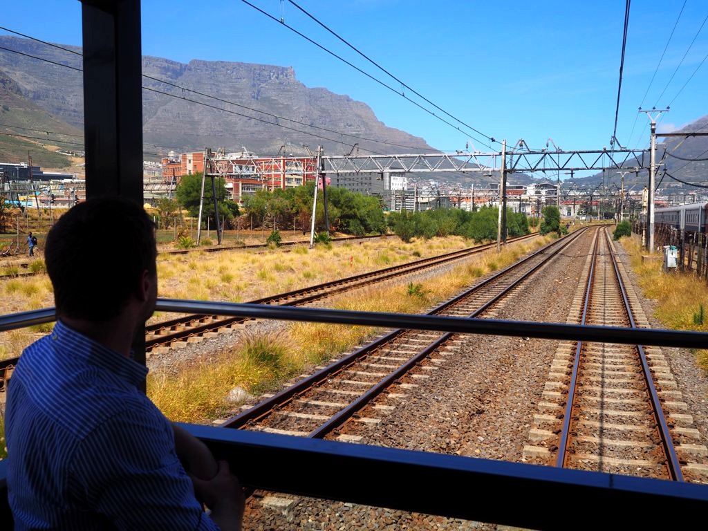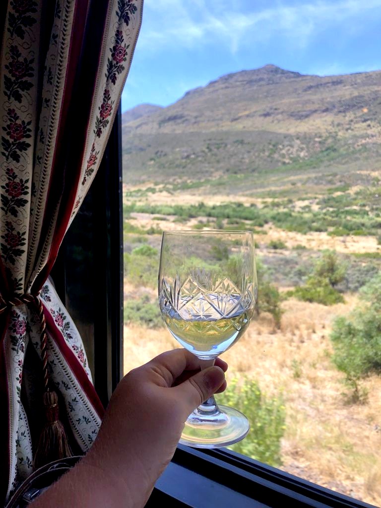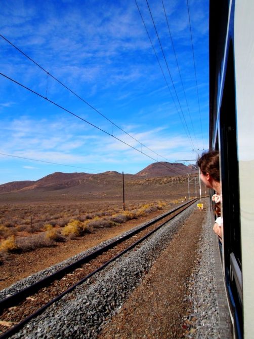 11h. Nos noms sont appelés un à un, et nous sommes escortés jusque dans notre cabine. Juste après, le train part de la voie 23 de la gare du Cap. Impossible de rester dans notre suite, nous avons envie d’explorer le train ! Après avoir fait le tour du propriétaire, nous trouvons ce qui sera notre place pendant l’essentiel du trajet : le wagon d’observation à l’arrière du train ! Quelques minutes plus tard, un nouveau verre de bulles nous est servi. Nous prendrons donc l’apéritif tout en disant au revoir au Cap (on aperçoit encore la Table Mountain), et en faisant la connaissance d’autres passagers.
