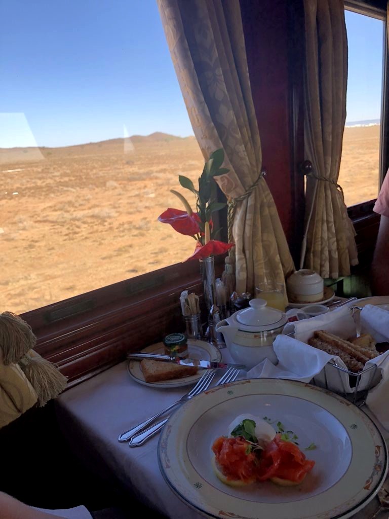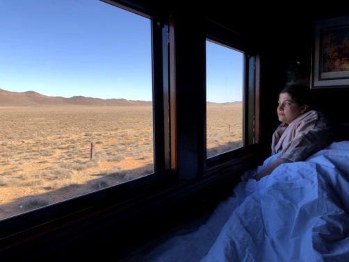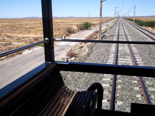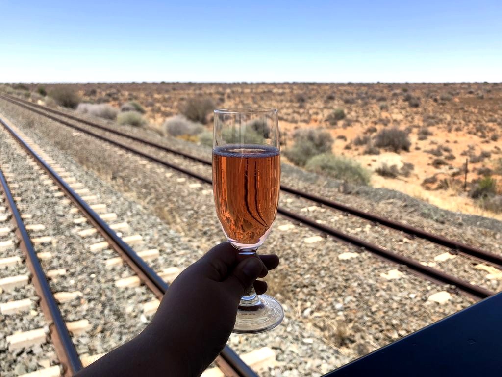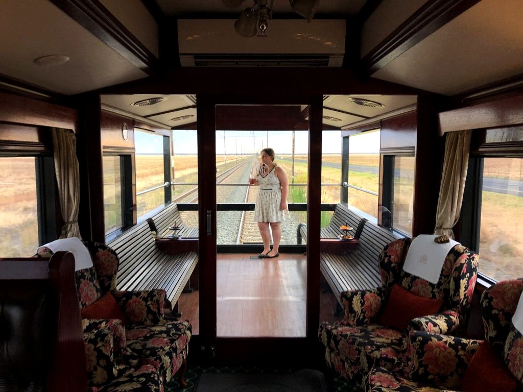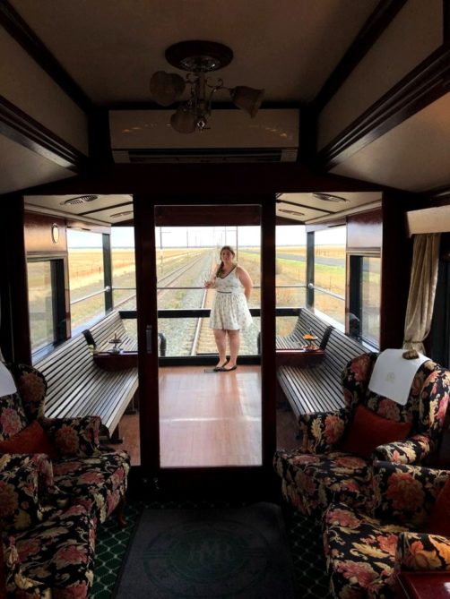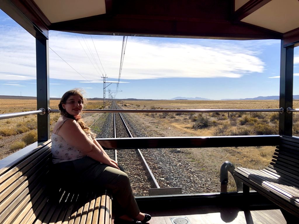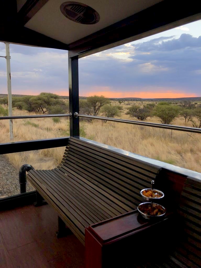 11h. Nos noms sont appelés un à un, et nous sommes escortés jusque dans notre cabine. Juste après, le train part de la voie 23 de la gare du Cap. Impossible de rester dans notre suite, nous avons envie d’explorer le train ! Après avoir fait le tour du propriétaire, nous trouvons ce qui sera notre place pendant l’essentiel du trajet : le wagon d’observation à l’arrière du train ! Quelques minutes plus tard, un nouveau verre de bulles nous est servi. Nous prendrons donc l’apéritif tout en disant au revoir au Cap (on aperçoit encore la Table Mountain), et en faisant la connaissance d’autres passagers.