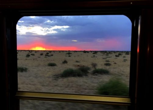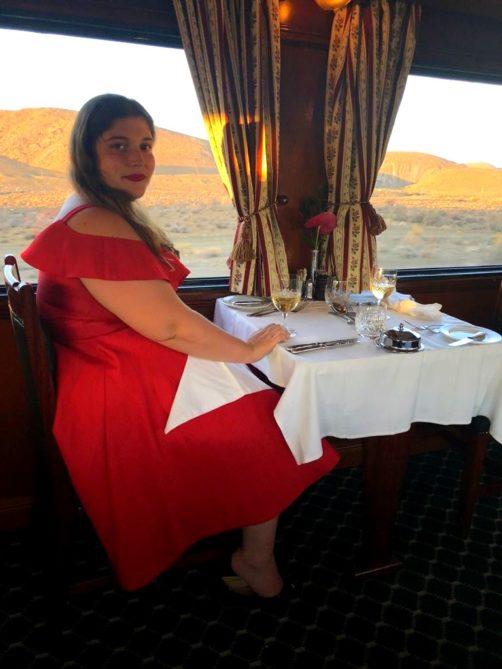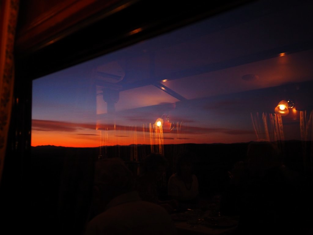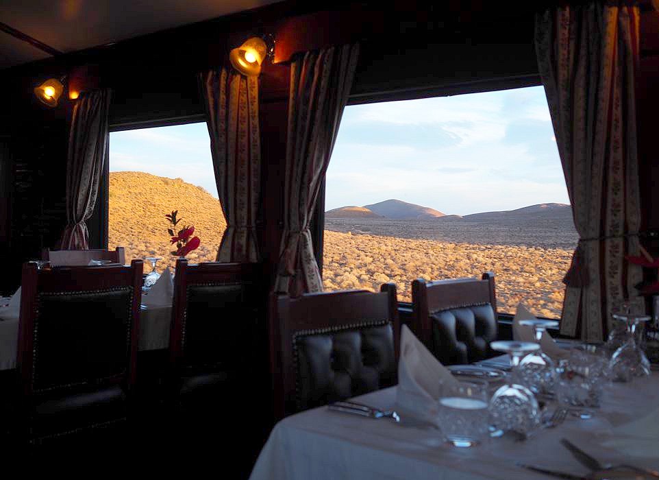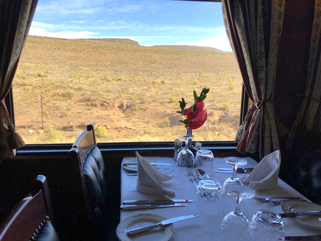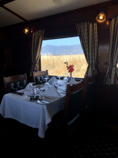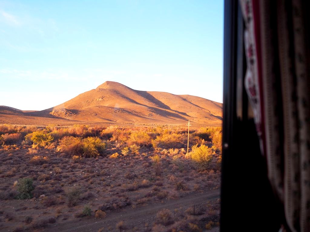 19h. C’est l’heure de dire au revoir à Matjiesfontein et de se préparer pour le repas du soir ! Dress code oblige, je revêtis une robe au style un peu rétro, avant d’aller admirer les vues sur le désert du Karoo depuis le wagon restaurant, entre pleines désertiques et montagnes arides.